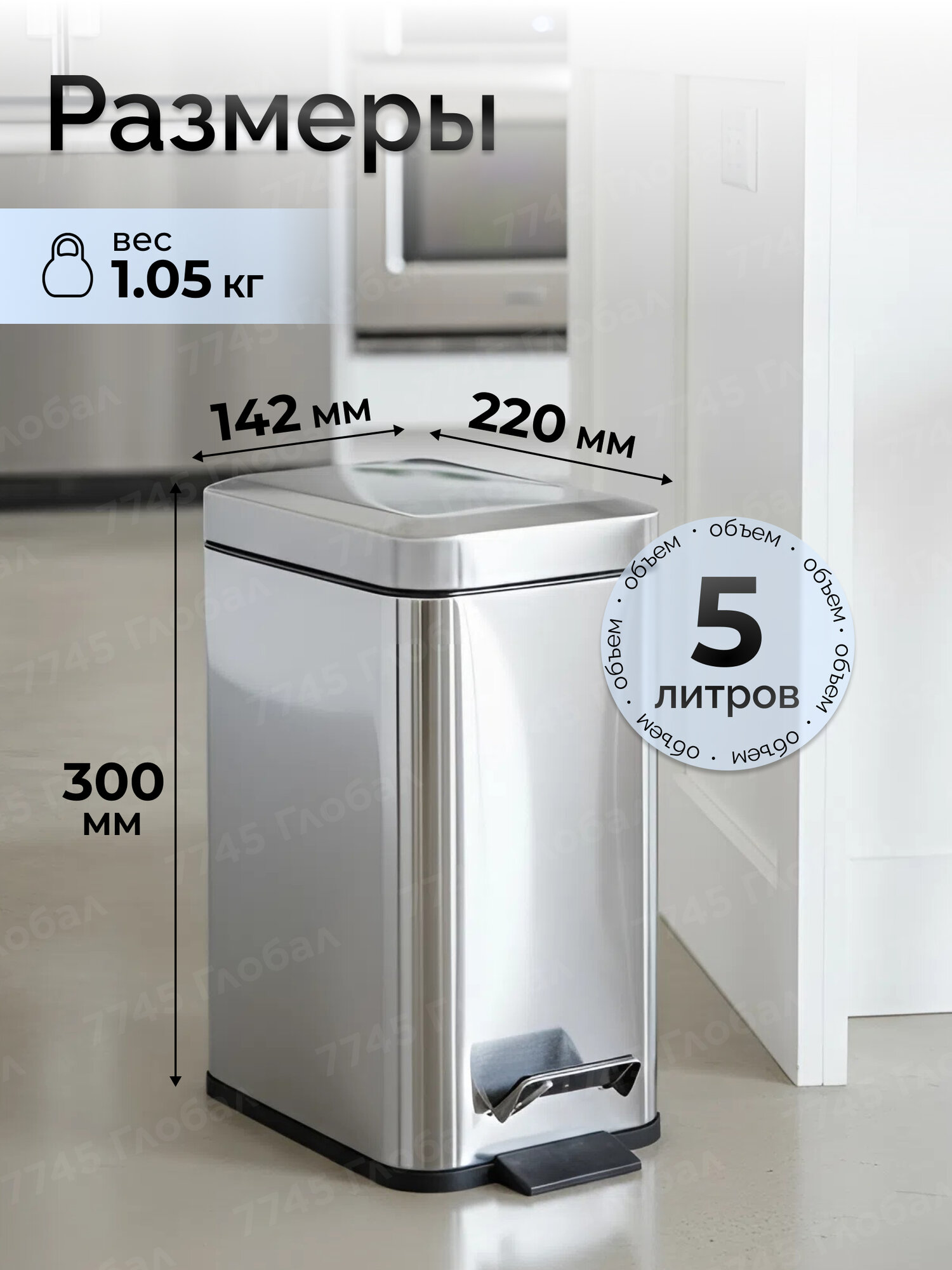 --- Технические характеристики: Материал: нержавеющая сталь, пластик Размеры: 270х142 мм Высота: 300 мм --- Ведро для мусора с педалью - отличный вариант для поддержания чистоты и гигиены на кухне, в санузле, офисах, заведениях общественного питания. Корпус изготовлен из нержавеющей стали. Эргономичное открывание крышки обеспечавается удобной педалью, Вам не нужно наклоняться, чтобы выбросить мусор. Плотное закрытие крышки предотвращает распространение запахов.