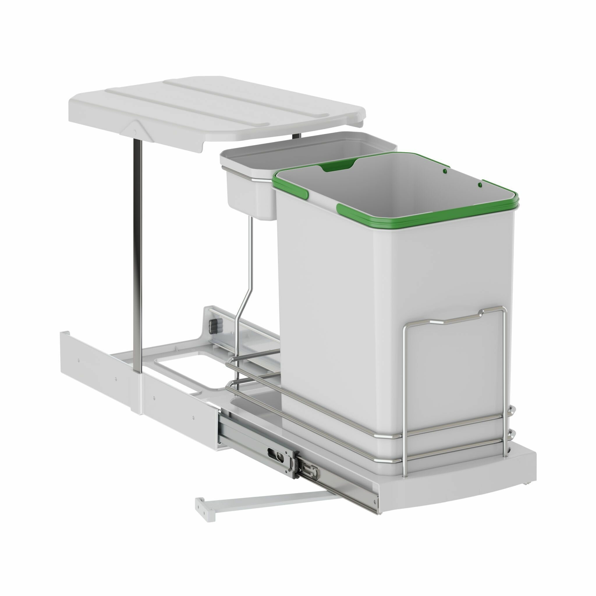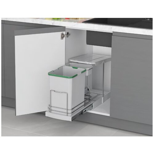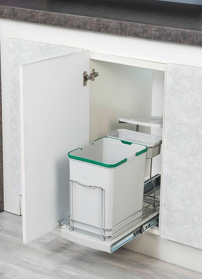 - автоматическое открывание крышки при открытии фасада при закрывании дверцы фасада ведро плотно закрывается крышкой и возвращается в корпус
