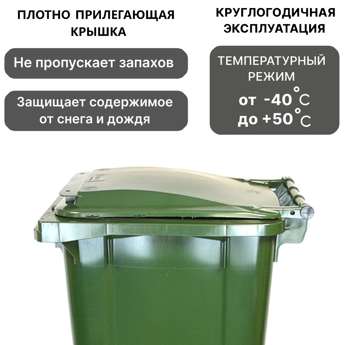 Мусорный контейнер для отходов предлагает высокую устойчивость к повреждениям, легкость, удобство в использовании и транспортировке. Плотно закрывающаяся крышка предотвращает выход неприятных запахов. Мусорный бак изготовлен из материала, который способен противостоять агрессивным химическим веществам. Он прост в уходе и долго сохраняет свой привлекательный вид и функциональность, что ставит его в ряды с лучшими альтернативами традиционным металлическим бакам.