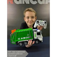 Мусоровоз на радиоуправлении работает на частоте 2.4 ГГц, пульт‑джойстик удобно лежит в руке и прост в освоении ребёнком. Машинка на пульте управления едет вперёд, назад, поворачивает вправо и влево, передние колёса поворачиваются, задний привод обеспечивает отличную манёвренность. Эта грузовая машинка на пульте управления прекрасно подходит для игр в песочнице, на стройке или в домашнем дворике.