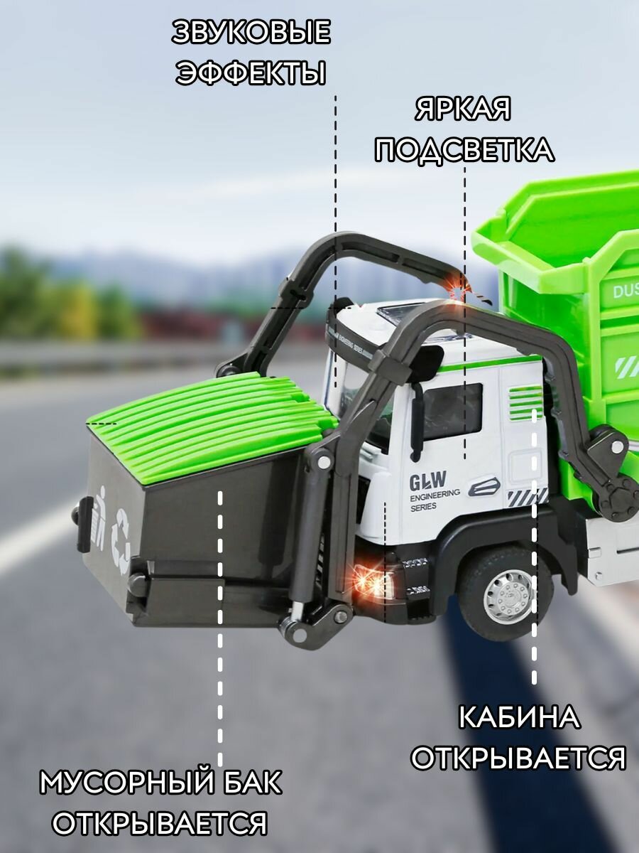 Купить Мусоровоз машинка со звуковыми и световыми эффектами и автоматической погрузкой / инерционные колеса с доставкой по всей России.