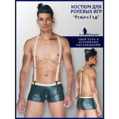 Костюм для мужчин, состоящий из трех предметов: трусов-боксеров, подтяжек и шапочки с перьями. Костюм из плотной гладкой ткани. Шапочка небольшая, также из плотной гладкой ткани, украшена перьями. В комплекте: трусы, подтяжки, шапочка. Размер: L-XL; Цвет: зеленый с белым; Материал: 60% полиамид, 40% полиуретан; Страна производителя: Турция; Бренд: La Blinque.
