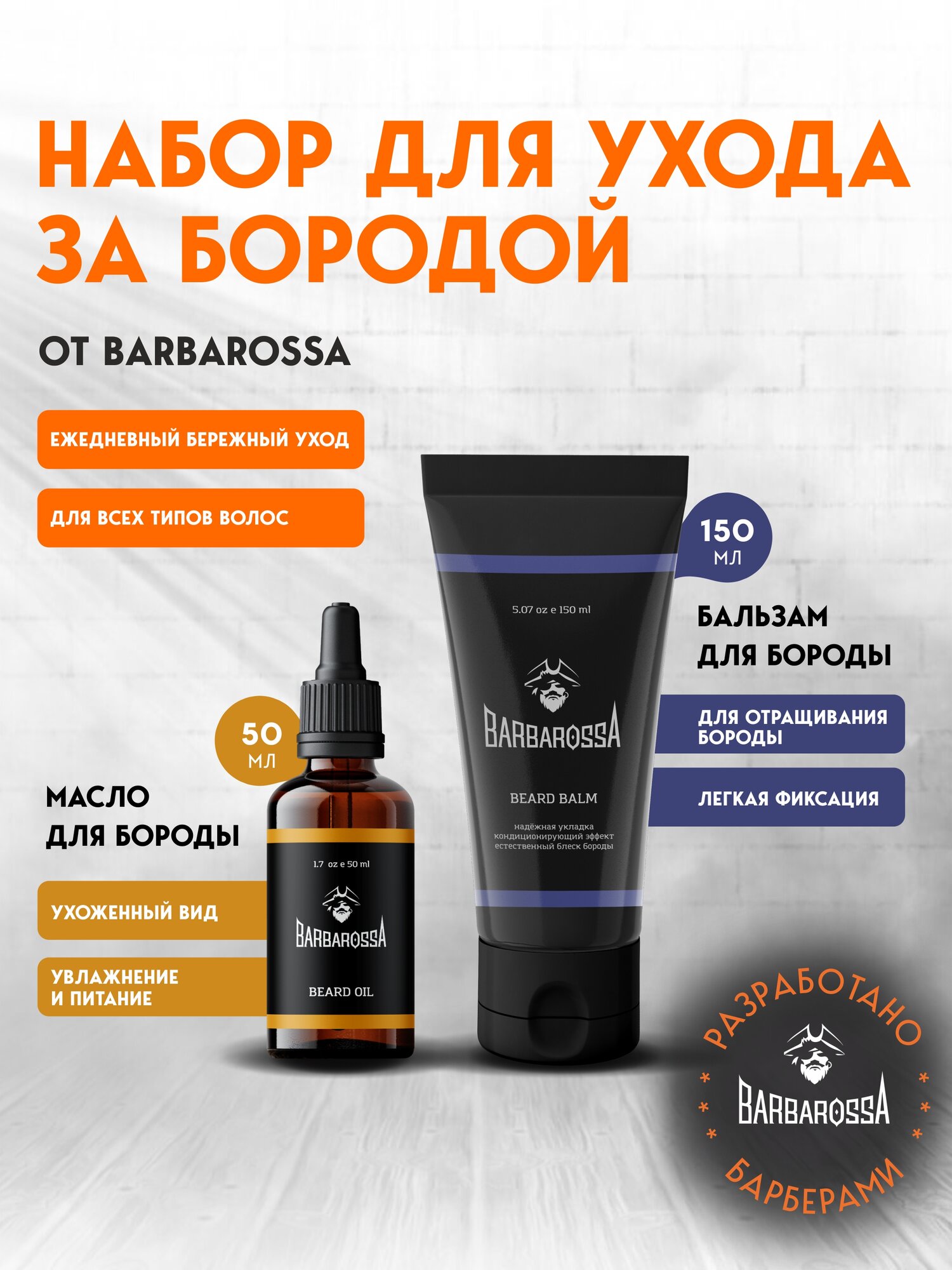 Купить Мужской набор для ухода за бородой BarbarossA: Масло для бороды 50 мл, Бальзам для бороды 150 мл. с доставкой по всей России.