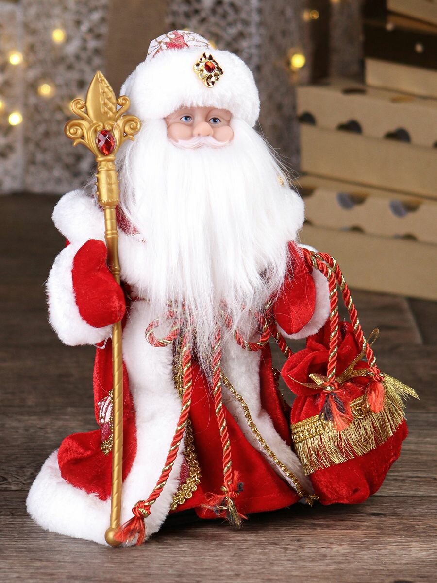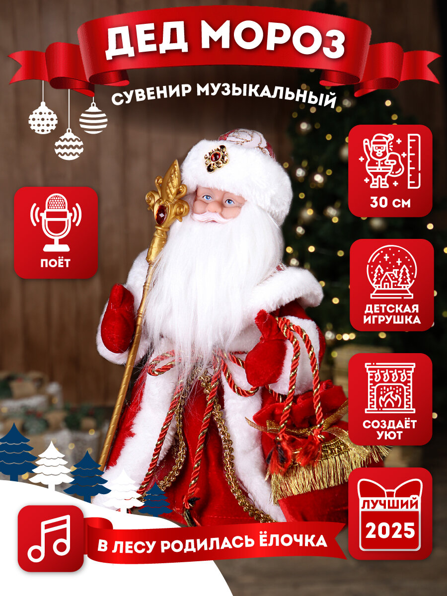 Музыкальный Дед Мороз в красной шубе, с мешком подарков, с мелодией, 30 см (в коробке) Музыкальная фигурка поможет создать новогодний уют в любом интерьере! Ее можно использовать как самостоятельное украшение или как дополнение любых декораций. Подарите праздник себе и своим близким, разместив фигурку под ёлку, возле елки, камина или на подоконник, и она будет напоминать вам и вашим близким о приближающемся торжестве. Такая фигурка станет настоящей изюминкой в праздничном убранстве вашего дома или офиса. Музыкальный и танцующий Дед Мороз изготовлен из текстильных материалов, пластика и природных материалов. Работают от четырех батареек AA, в комплект не входят. Размер: 30 см.