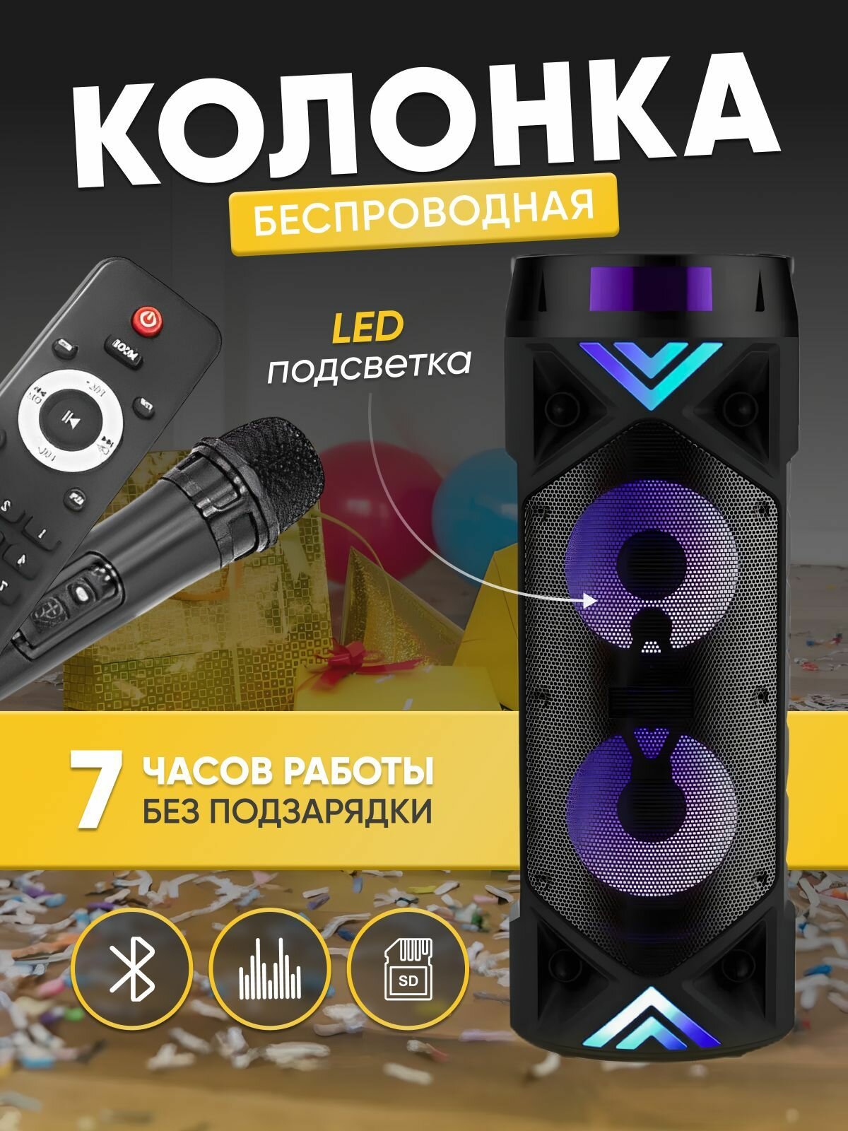 Колонка оснащена большой мощностью и поддерживает Bluetooth, что позволяет легко подключаться к любому устройству с Bluetooth-модулем. Благодаря этому вы сможете без проблем воспроизводить музыку с вашего смартфона, планшета или компьютера.