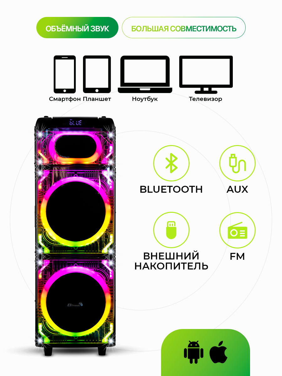 Представляем вашему вниманию портативную акустическую систему Eltronic 20-22 SKILLETS BOX 2500. Это устройство, которое сочетает в себе мощность, функциональность и удобство использования. Eltronic 20-22 SKILLETS BOX 2500 оснащена двумя 10-дюймовыми динамиками, которые обеспечивают мощный и чистый звук. Частотный диапазон составляет от 50 Гц до 20 кГц, а соотношение сигнал/шум равно 86 дБ. Устройство поддерживает различные режимы воспроизведения: Bluetooth, внешний накопитель, Aux, FM. Это позволяет легко подключить его к различным устройствам и источникам звука. Eltronic 20-22 SKILLETS BOX 2500 имеет встроенный аккумулятор на 12В/7А, что позволяет использовать ее в любом месте без необходимости подключения к сети. Устройство оснащено различными разъемами: USB, MicroSD, SD, Jack 6.3 мм для микрофона и гитары. Это позволяет подключать к колонке различные устройства и аксессуары. Eltronic 20-22 SKILLETS BOX 2500 имеет функцию TWS, которая позволяет соединить две колонки в акустическую систему через Bluetooth. Это дает возможность создать более объемное и мощное звучание. Устройство имеет дисплей, регулировку звучания микрофонов, LED подсветку динамика, шестиполосный эквалайзер, возможность записи звука и управление диапазонами частот звучания. Акустическая система Eltronic 20-22 SKILLETS BOX 2500 имеет удобную колесную систему для транспортировки. В комплект поставки входят беспроводной микрофон (2 шт), пульт, кабель AUX и инструкция. Выбирая Eltronic 20-22 SKILLETS BOX 2500, вы получаете мощное, функциональное и удобное устройство для воспроизведения музыки и проведения мероприятий. ElTRONIC 20-22 SKILLETS BOX акустическая колонка 2*10" динамикков Режимы воспроизведения: - Bluetooth - Внешний накопитель - Aux - FM Мощность: - 2500 Ватт PMPO - 250 Ватт RMS Питание: - Сеть 220V (только от сети) - Встроенный аккумулятор 12В/7А Разъемы: - USB - MicroSD - SD - Jack 6.3 мм (микрофон, гитара) 2 шт. Звук: - Частотный диапазон: 50HZ-20KHZ - Сигнал/Шум: 86dB - Разделение: 50dB Комплектация: - Беспроводной микрофон - 2 шт - Пульт - Кабель AUX - Инструкция Размер упаковки: Ширина - 38 см Высота -104 см Глубина - 38 см Вес нетто - 17 кг Дополнительно: TWS функция соединения двух колонок в акустическую систему через Bluetooth Дисплей Регулировка звучания микрофонов LED подсветка динамика (активная) Шести полосный эквалайзер Возможность записи звука Управление диапазонами частот звучания Колесики для удобства транспортировки