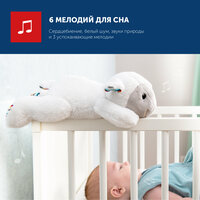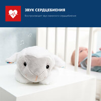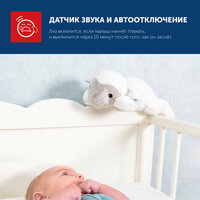 Проигрывает 6разных звуков. Звук сердцебиения, водопад и4успокаивающие мелодии. Режим автоматического выключения. Через 10минут звук выключится сам. Включается, когда малыш начинает плакать. Датчик звука реагирует наплач ребёнка ивключает успокаивающий звук, если малыш проснулся. Регулируемая громкость. Выможете выбрать нужный вам уровень громкости. Включится, если его потрясти. Нет необходимости включать музыку, просто потрясите игрушку, ионначнёт проигрывать последнюю песню.