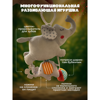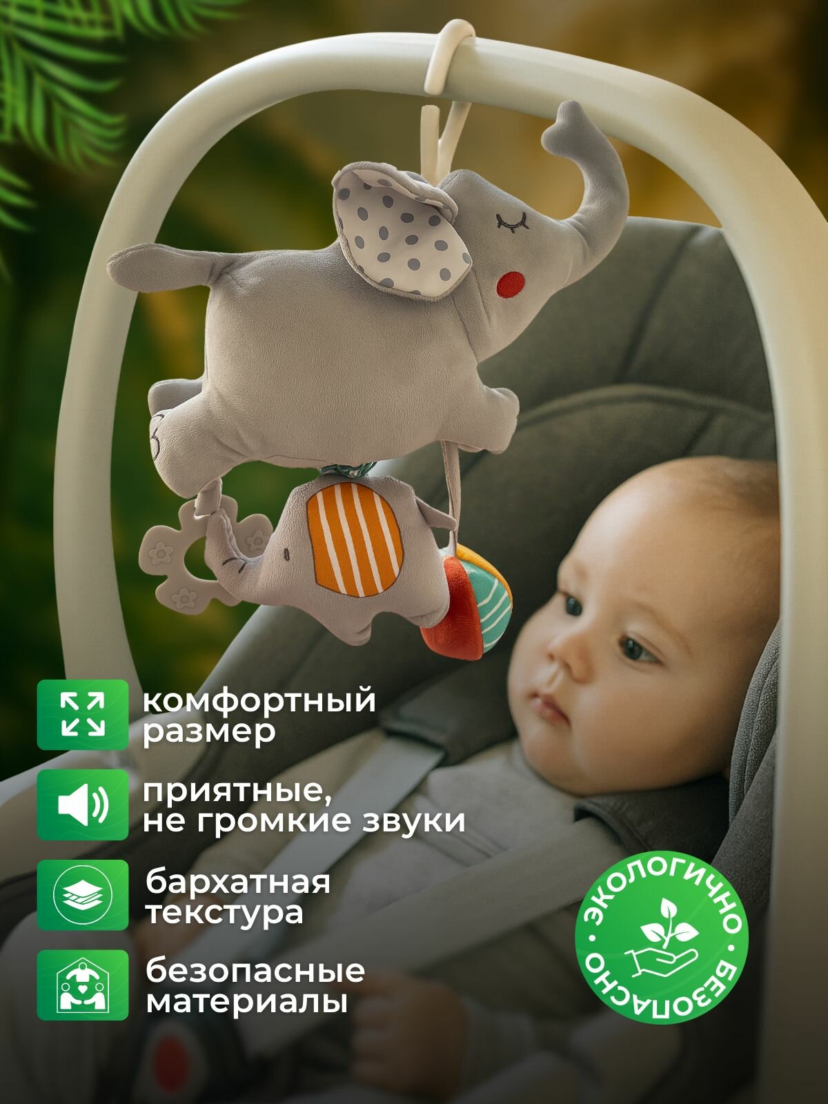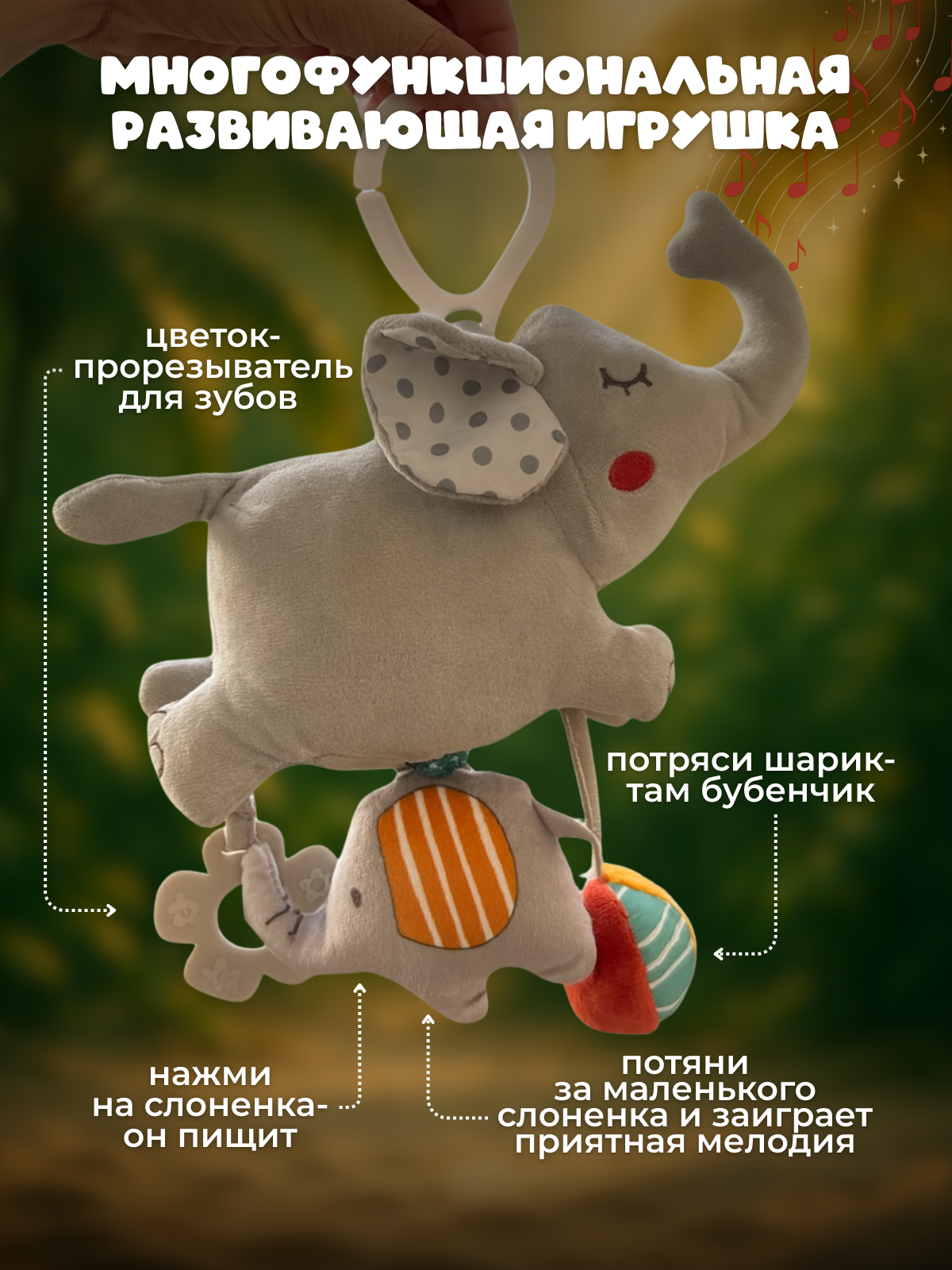 Наш необыкновенно милый музыкальный слоник порадует малыша дружелюбным эстетичным видом, интересным дизайном, мягкой бархатной фактурой материалов, приятными звуками, а также наличием грызунка, помогающего малышу в нелегкие моменты прорезывания зубов.