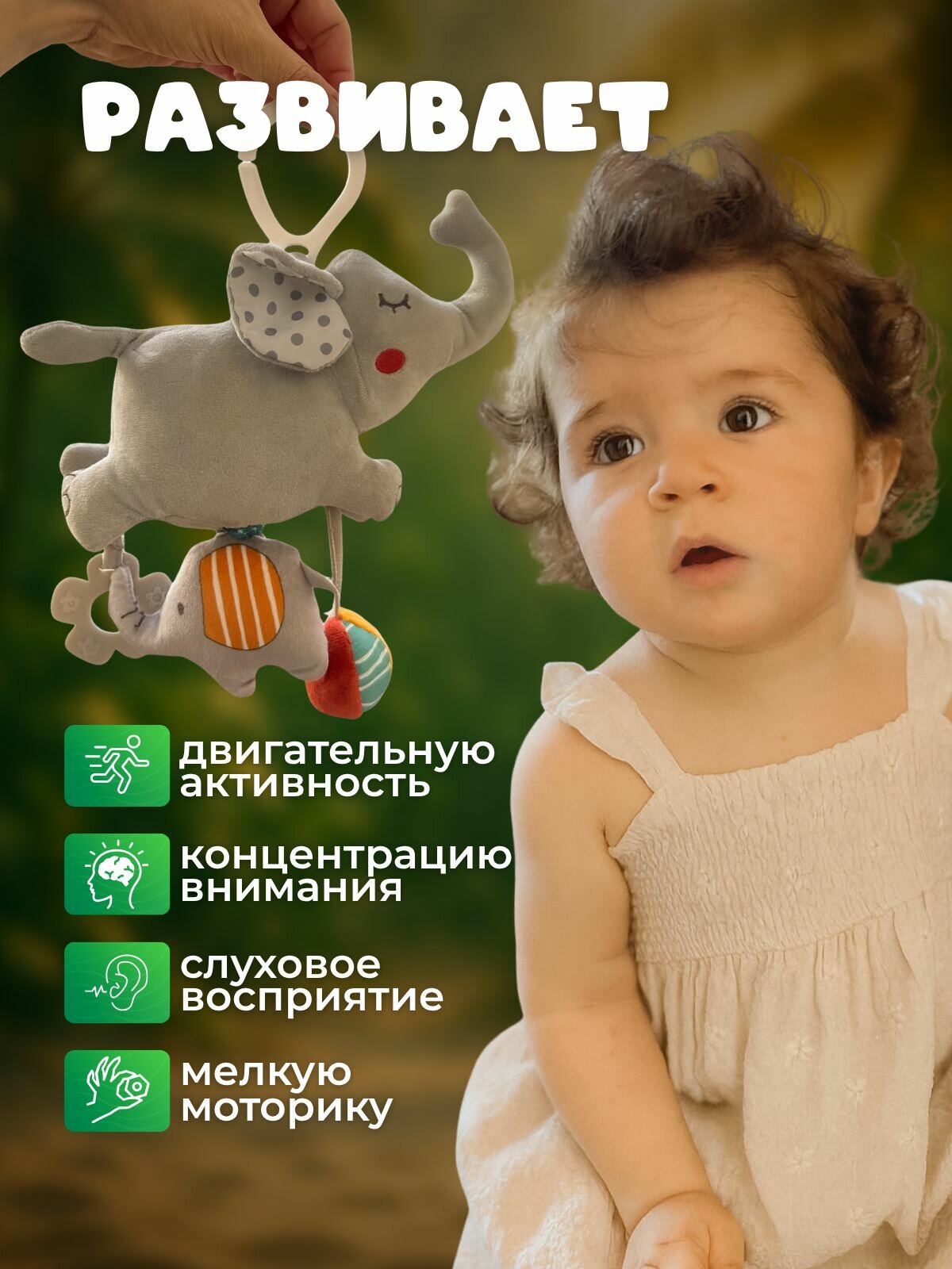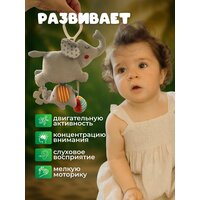 Погремушка-подвеска развивает двигательную активность, логику, концентрацию внимания, причинно-следственные связи, слуховое восприятие и мелкую моторику.