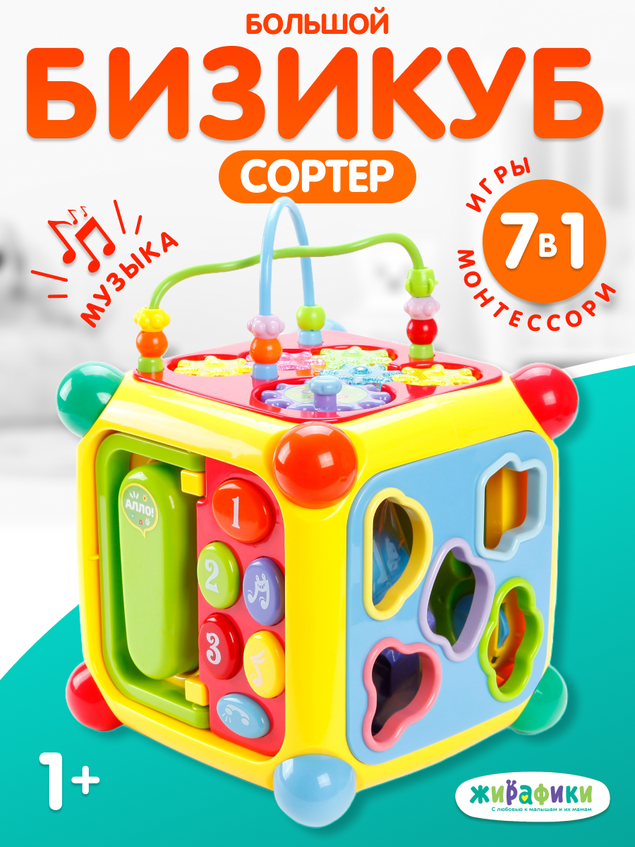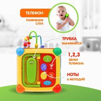 На каждой стороне куба расположены разные развивающие игры, такие как сортеры, игрушка-лабиринт, телефон для малышей, музыкальное пианино и дверца.