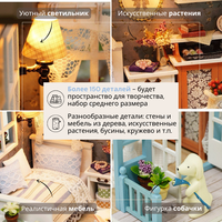 В наборе 150 деталей для сборки: деревянная мебель, ткань, керамика, искусственные растения, бусины, кружево, специальный клей, иллюстрированная инструкция на русском языке, пинцет, музыкальный механизм, уютная подсветка, фигурка собачки, прозрачный купол для защиты от пыли.