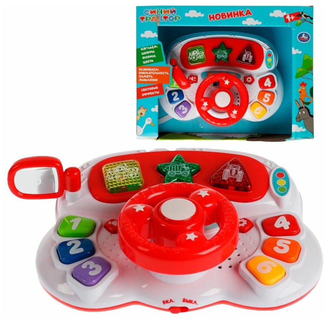 Музыкальный руль /Синий трактор/ ТМ /УМка/ понравится юным поклонникам мультсериала про весёлый трактор: - 8 песен, стихов и звуков - изучаем цифры, формы, цвета - световые эффекты