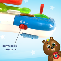 Игрушка воспроизводит 20 мелодий и звуков. Можно вращать руль, нажимать на кнопки и двигать детали.
