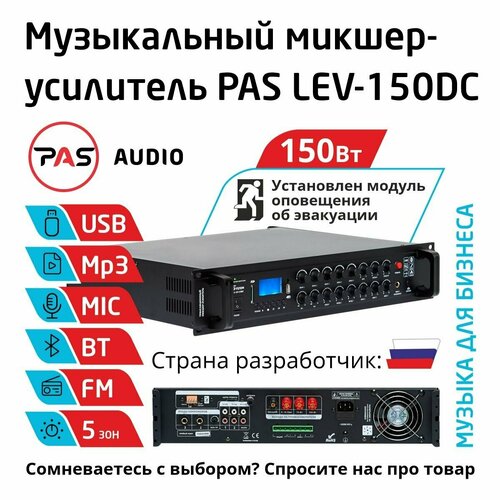 Музыкальный трансляционный микшер-усилитель 150 вт 5 зон с MP3-BT-FM плеером и модулем оповещения PASystem LEV-150DC: сравнение цен, характеристики, фото, актуальное наличие и цены.