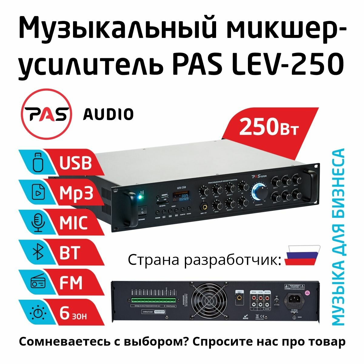 Музыкальный трансляционный микшер-усилитель 250 Вт 6 зон с MP3-BT-FM плеером PASystem LEV-250: сравнение цен, характеристики, фото, актуальное наличие и цены.