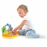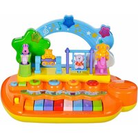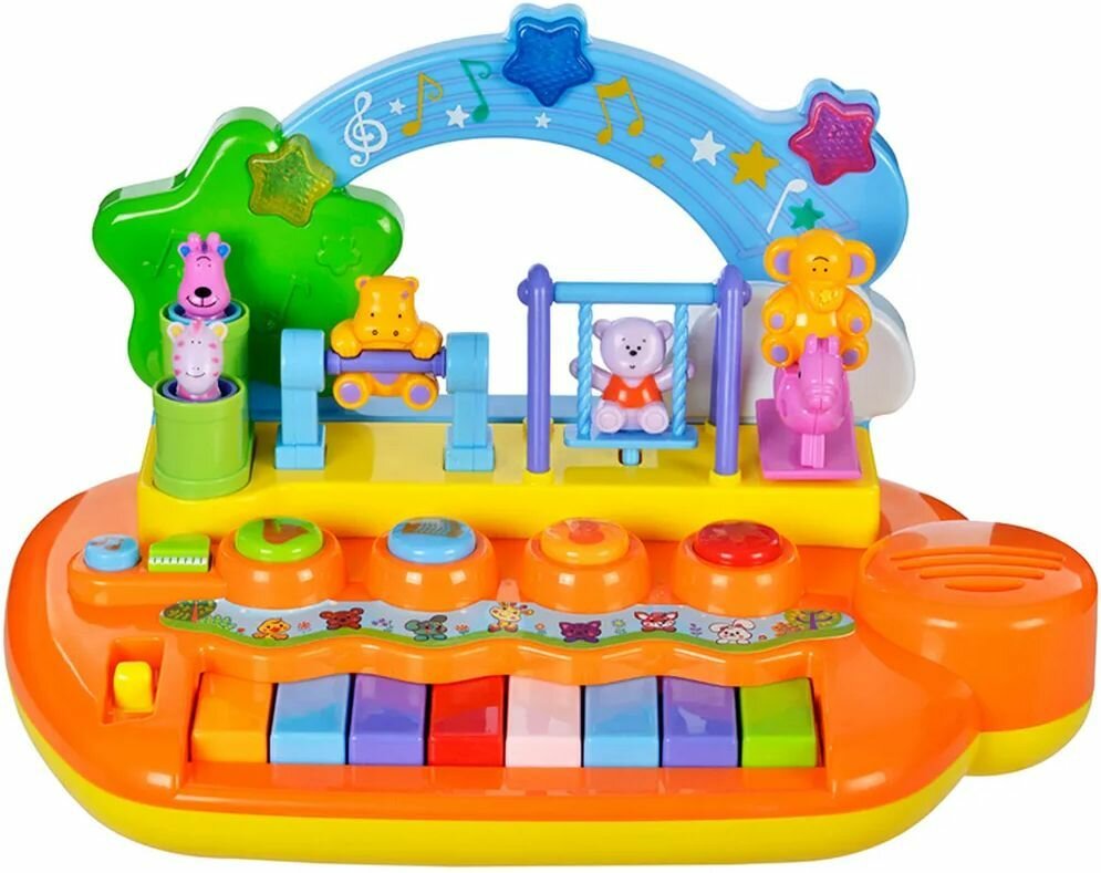 Это детское пианино с диапазоном в одну октаву предназначено для малышей. Над клавиатурой пианино расположены кнопки с изображением музыкальных инструментов. При нажатии на эти кнопки звучание пианино становится похожим на звучание соответствующего музыкального инструмента. Кнопка с изображением ноток включает режим проигрывания мелодий. Когда малыш играет на пианино или слушает музыку, на радуге зажигаются разноцветные огоньки и парк развлечений на самом верхнем ярусе пианино приходит в движение: слоник скачет на лошадке, медвежонок качается на качелях, бегемотик крутится на турнике и т. д. Игрушка работает от 3 батареек АА на 1,5 V. Элементы питания не входят в комплект. Размер: 28х17х15 см. Рекомендованный возраст: 9 мес. +.