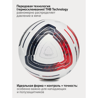 Мяч выполнен по технологии термосклеивания THB Technology, благодаря чему обладает идеально круглой формой, герметичен и не пропускает влагу внутрь, а давление в мяче распределяется равномерно. Текстура поверхности материла разработана по технологии Grip Skin - для максимального контроля в любую погоду. Оригинальная 8-панельная конструкция выделяет мяч среди других. Это экологичный мяч и поэтому в подкладке мяча используется переработанный материал, который получается из 4 пластиковых полулитровых бутылок.
