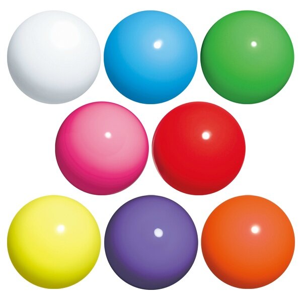 Мяч для художественной гимнастики, ярких цветовых оттенков, с приглушённым глянцем. Сертифицирован Международной федерацией гимнастики. Диаметр: 185 мм, вес: 400 г.
