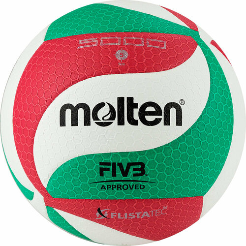 Волейбольный мяч MOLTEN V5M5000 одобрен FIVB (FIVB Approved). Разработан с использованием технологии Flistatec® (Flight Stability Technology -Технология Устойчивости Полета). Использование более мягкого и толстого слоя микроволокна, который в сочетании с защитным нейлоновым слоем улучшает сцепку с мячом, обеспечивая более точное выполнение верхней передачи. Мягкая матовая синтетическая кожа, 2 подкладочных слоя из синт. ткани, 18 панелей, клееный, камера выполнена из натурального латекса. Логотип DVV- Немецкой волейбольной ассоциации.