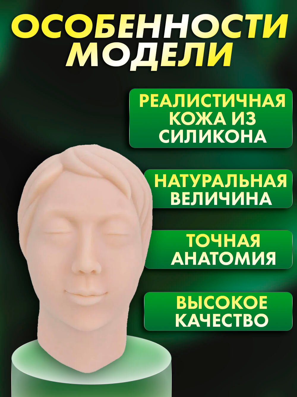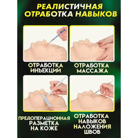 3D модель головы имеет размеры 27,5 на 17,5 см, что делает её удобной для использования в различных учебных заведениях и на курсах повышения квалификации. В комплект входят салфетка и два шприца для инъекций, что позволяет сразу приступить к практике и отрабатывать точность движений и технику выполнения процедур.