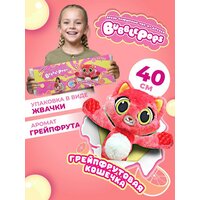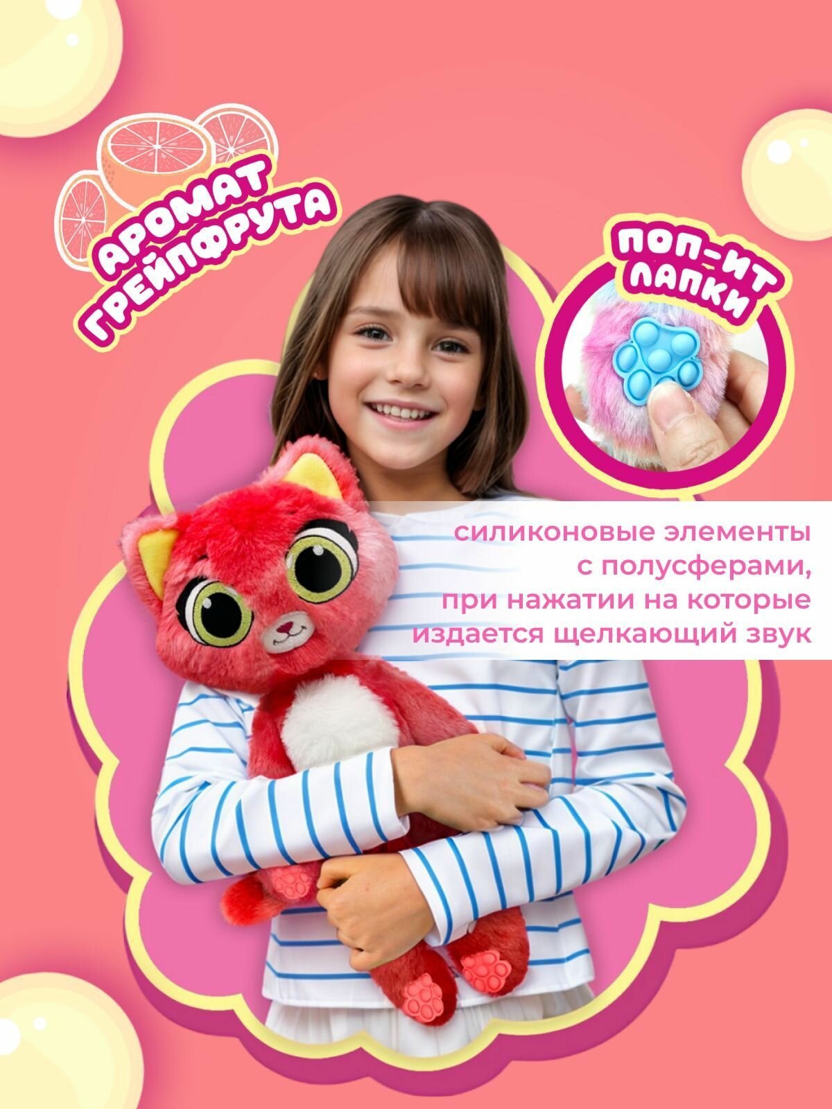 Мягкая игрушка 34 см в виде кошечки, с ароматизатором и функцией поп-ит на лапках (силиконовые элементы с полусферами, при нажатии на которые издается щелкающий звук). Игрушка упакована в вакуумный пакет и распрямляется до нормальных размеров после вскрытия пакета. Наружняя часть упаковки имеет дизайн пластинки жевательной резинки. Максимальный возраст ребенка: До 10 лет; Вид мягкой игрушки: Кошка; Минимальный возраст ребенка: От 3 лет; Высота игрушки: 34; Пол ребенка: Девочки;
