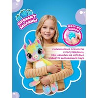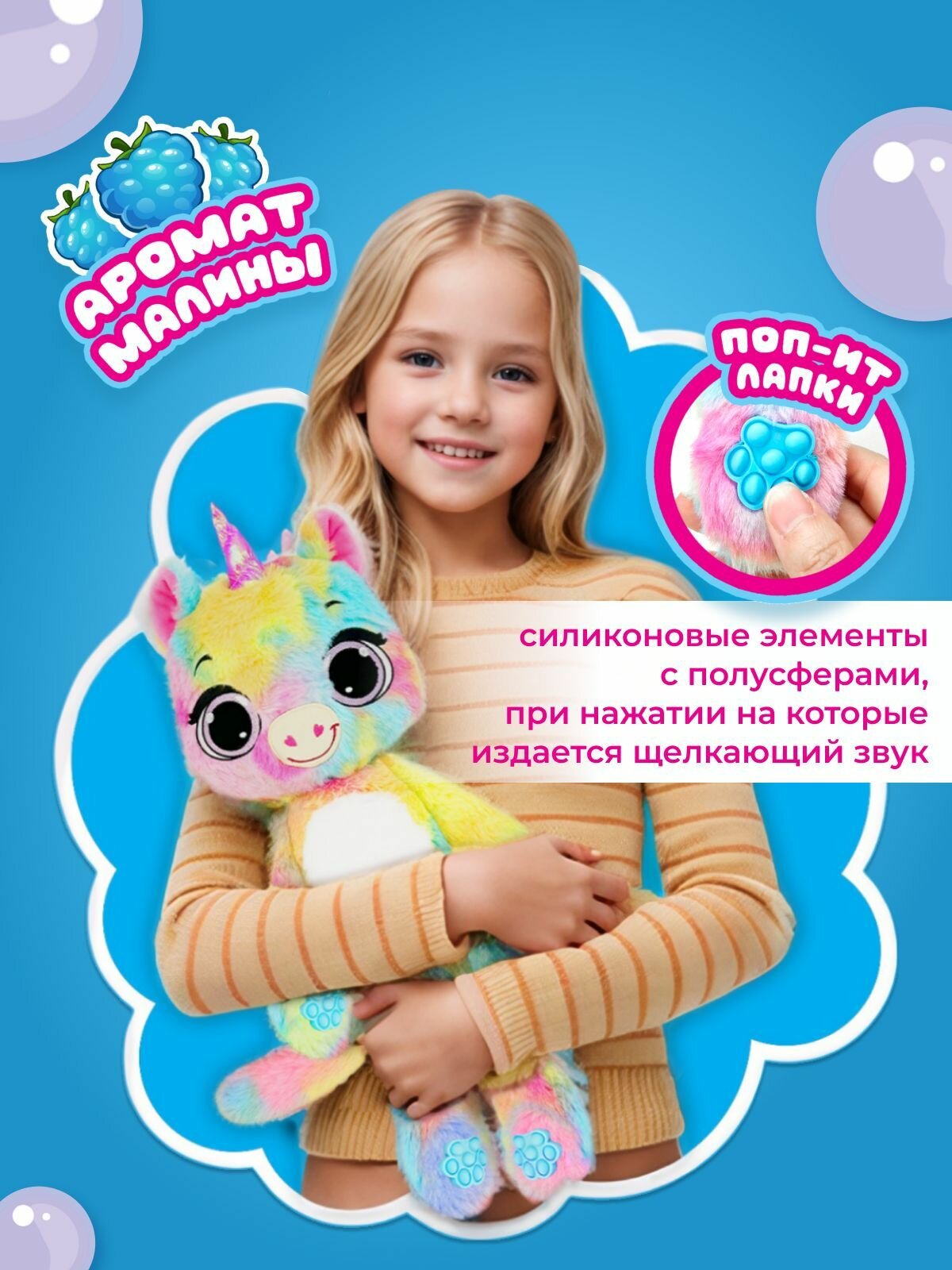 Мягкая игрушка BubblePops Малиновый единорог — это не просто мягкая игрушка, а настоящий приятный сюрприз для детей и их родителей. Высота от 34-47см, она идеально подходит для обнимания, а её ароматизатор придаёт особую атмосферу уюта и комфорта. Аромат, который выделяет игрушка, создаёт ощущение волшебства, позволяя детям погрузиться в мир своих фантазий. Функция поп-ит на лапках делает эту игрушку ещё более увлекательной. Силиконовые элементы с полусферами не только приятно щелкают при нажатии, но и развивают тактильные ощущения у детей. Эта особенность помогает развивать моторику у детей. Игрушка станет отличным компаньоном для игр как дома, так и на улице. Упаковка в виде пластинки жевательной резинки добавляет элемент креативности и яркости. Вакуумная упаковка позволяет сохранить форму игрушки до момента вскрытия, после чего она расправляется в течении суток, превращаясь в милого друга. BubblePops Малиновый единорог станет превосходным подарком на любой праздник, будь то 8 марта, день рождения или Новый год, радуя своим уникальным дизайном.