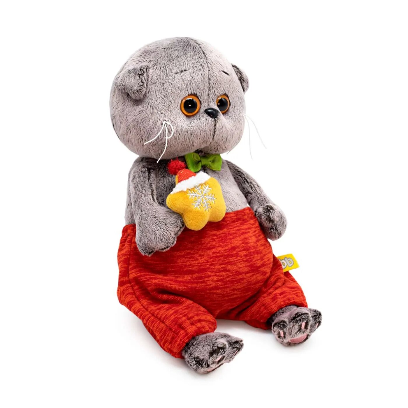 Возраст: с рождения. Эта мягкая игрушка кот Басик - такая милая и по-настоящему новогодняя! Все потому, что наш пушистый друг надел теплые красные штанишки, так здорово подходящие для долгожданных зимних торжеств, галстук-бабочку и не забыл про свою новенькую игрушку - плюшевое рождественское печенье с красным колпачком. Размер: туловище - 20 см. Материалы: искусственный мех, текстиль, пластмасса.