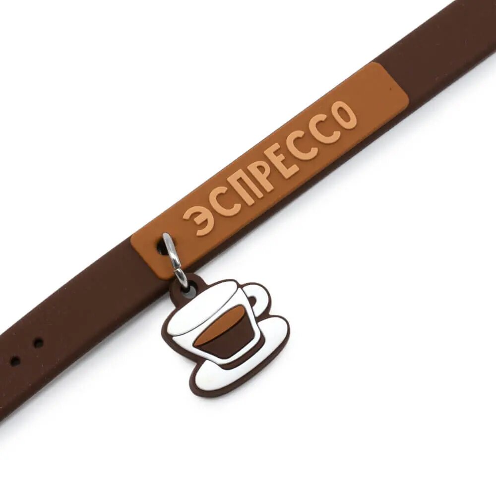 На шее у котенка Эспрессо находится силиконовый чокер с названием и небольшим подвесом в виде чашечки с кофе эспрессо. Чокер легко снимается и может послужить в качестве модного браслета для хозяина.