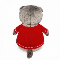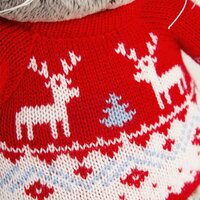 Кот Басик в шикарном свитере с норвежским орнаментом. Белые олени и морозно-голубые ёлочка и полосы украшают перед свитера. Свитер связан из мягкой шерстяной пряжи яркого алого цвета.