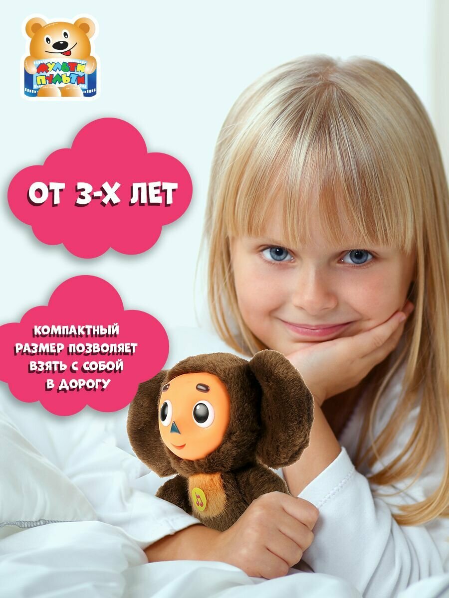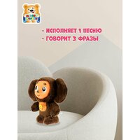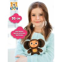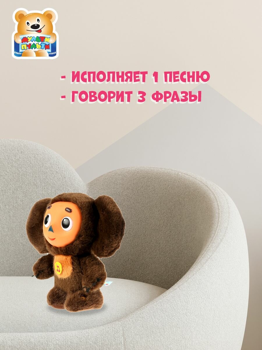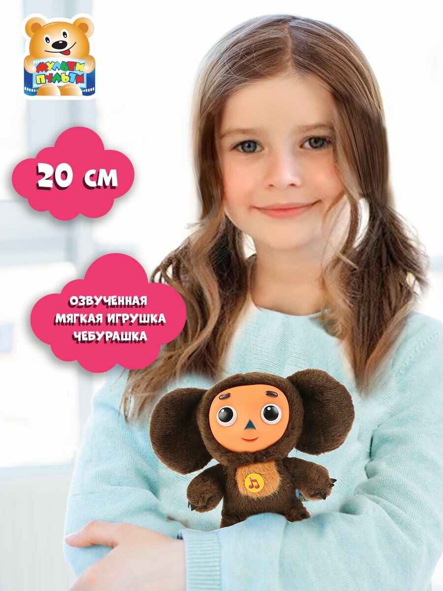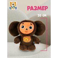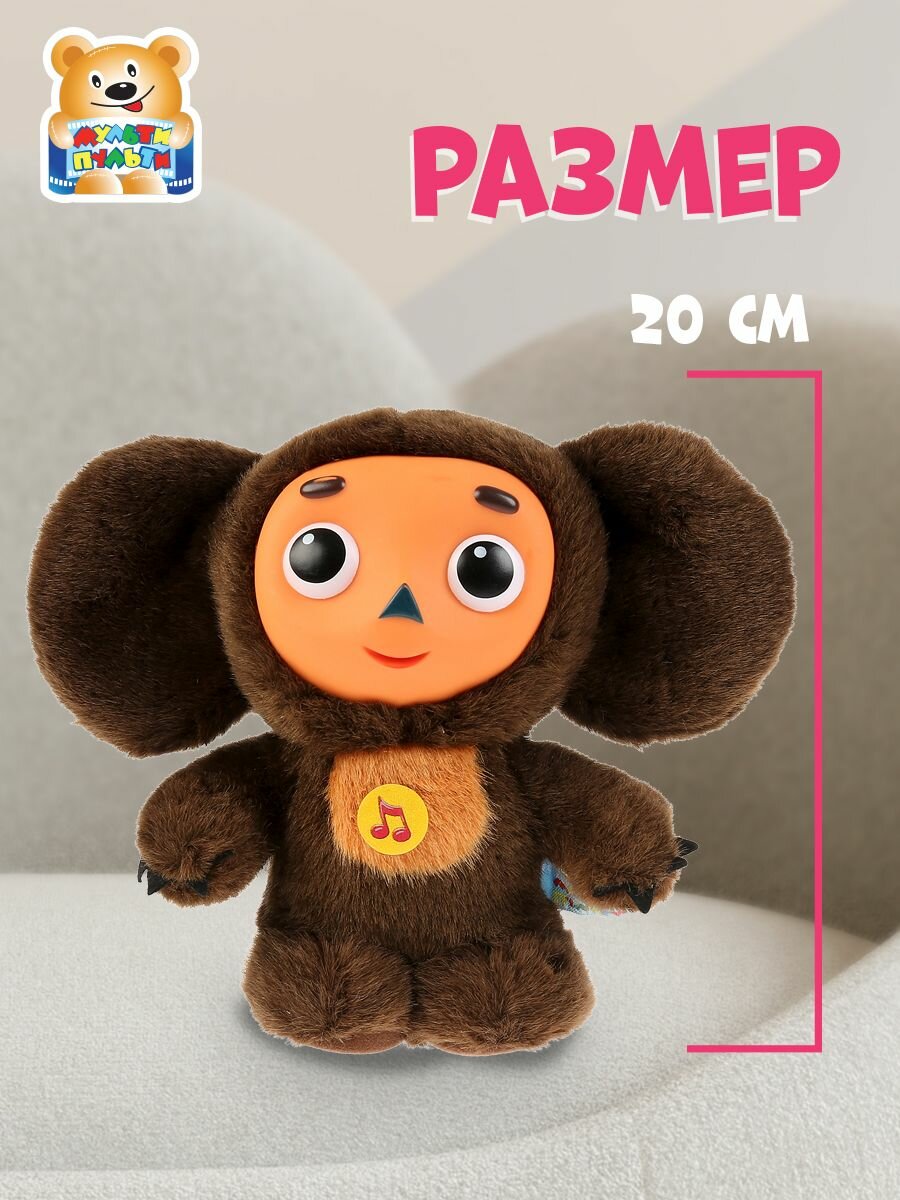 игрушка Чебурашка с музыкальным чипом, высота 20 см, выполнена из искусственного меха и пластмассы, предназначена для детей, активирует звук при нажатии на кнопку