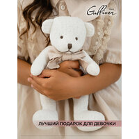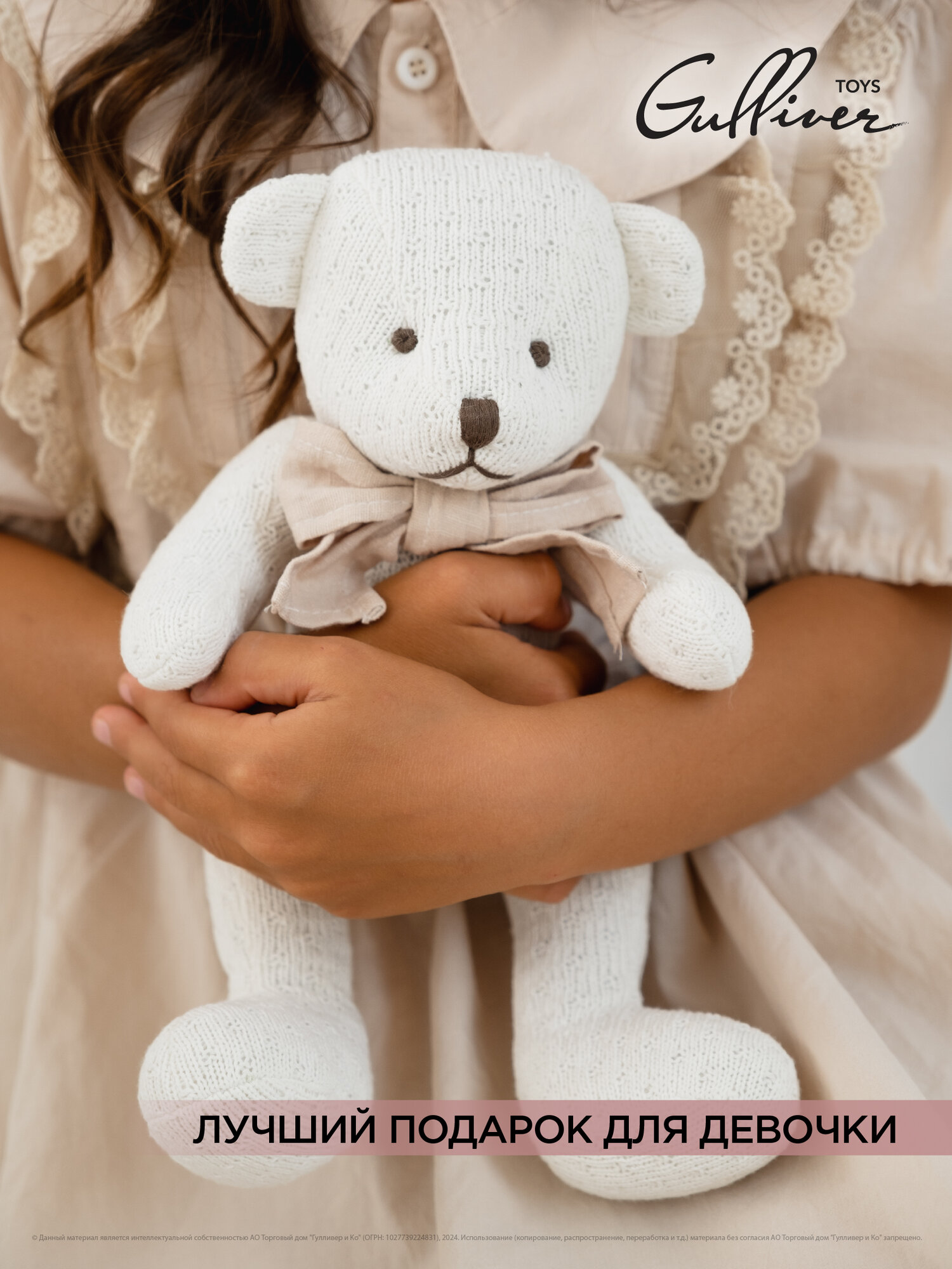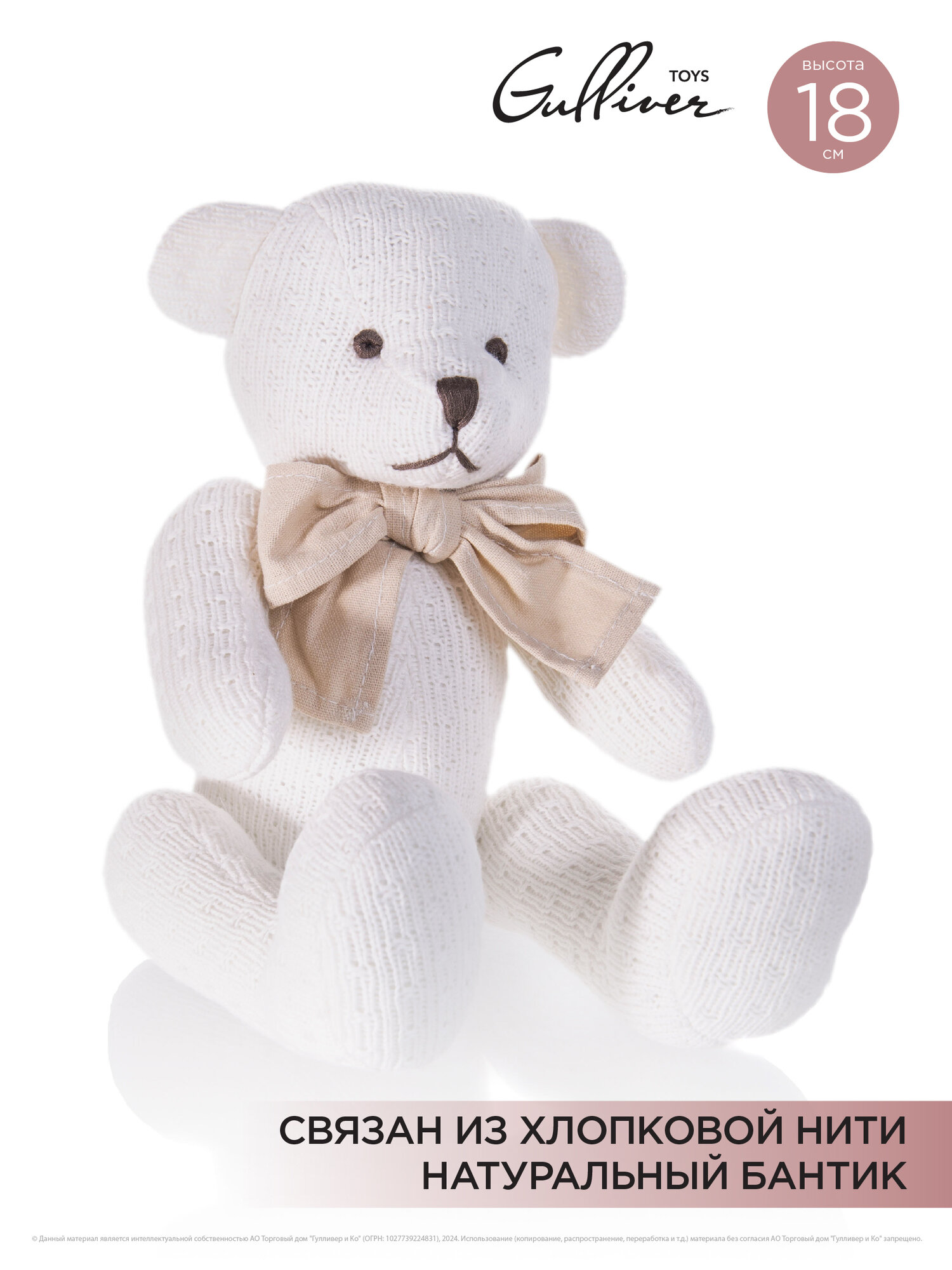Мишка Ларс от Gulliver — это вязаная мягкая игрушка в виде милого медвежонка белого цвета с бежевым бантиком на шее. Глазки и носик аккуратно вышиты, что делает его безопасным и приятным на ощупь. Этот маленький плюшевый медвежонок идеально подходит для детей.