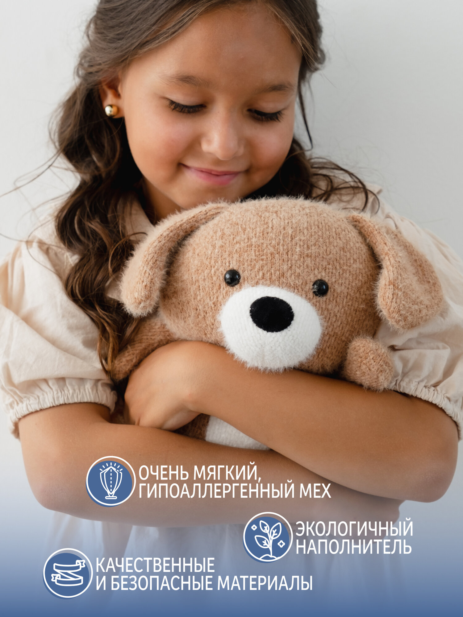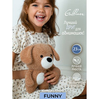 Мягкая вязаная игрушка собачка Шарик станет отличным подарком для детей и взрослых. Эта плюшевая сплюшка выполнена из необычного материала, который напоминает вязаную материю с небольшим пушком, благодаря чему изделие очень приятное на ощупь. Игрушечная собака плотно набита, что делает ее особенно комфортной для сна малыша, обнимашек или как антистресс. Основной цвет — светло-коричневый, животик, мордочка и вставки в ушках — белые. Высота изделия составляет около 23 см, такой размер удобно брать с собой на улицу или в дорогу.