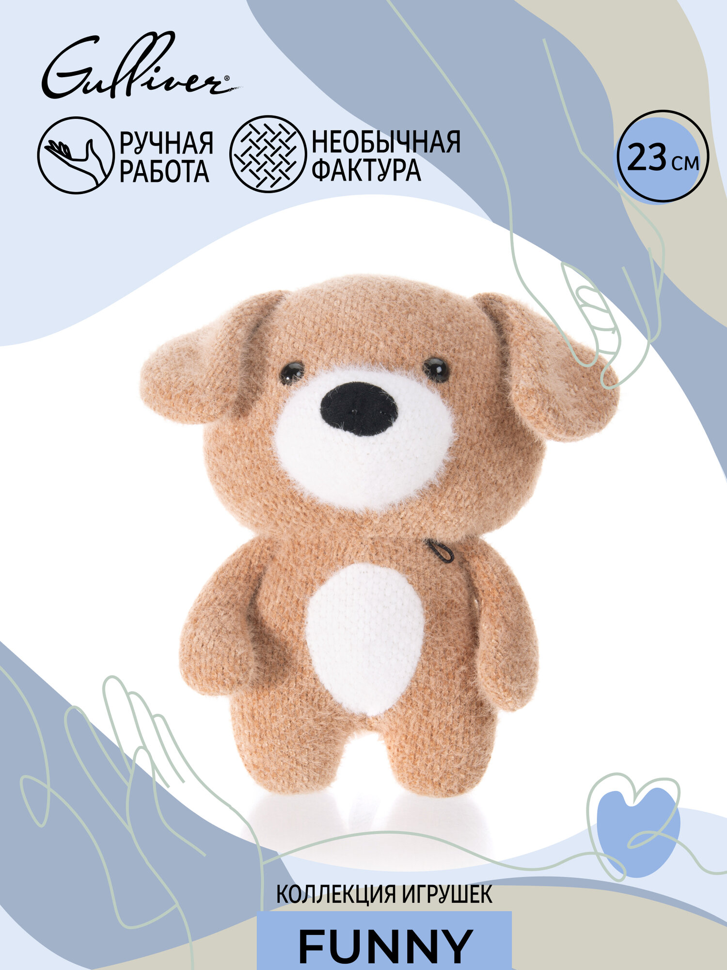 Изделие аккуратно упаковано в плотную прозрачную брендированную сумочку на кнопках — получать такую вещь всегда приятно. Щенок вызывает позитивные эмоции уже с первого взгляда благодаря милой мордочке и мягким ушкам.
