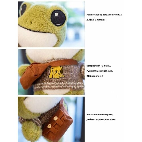 Игрушка мягкая Лягушка глазастая в бандане, в коричневой кофточке, полосатой кофточке с сумочкой изготовлена из приятных на ощупь материалов и аккуратно прошита. Милая мягкая игрушка лягушка - это идеальный способ порадовать вашего малыша, обеспечив ему приятный сон. Независимо от того, у вас новорожденный мальчик или девочка, наша игрушка для сна станет идеальным спутником в коляске, на прогулке или в автомобиле. Наша мягкая игрушка лягушка имеет размер 27 см, выполненную в зеленых тонах. Глаза у лягушки блестят при попадании света. Легко можно снять одежду и заменить на другую по необходимости. Мягкая игрушка лягушонок подушка имеет милые глаза и одет в яркую нарядную одежду, которая делает его еще более привлекательным для малышей. Эта плюшевая лягушка мягкая игрушка - это идеальная обнимашка для малышей, созданная из мягкого и приятного на ощупь материала. Игрушка лягушонок помогает создать спокойную и уютную атмосферу для маленьких детей, заставляя их чувствовать себя в безопасности и комфортно во время сна и отдыха. Лягушонок игрушка для мальчика имеет легкий вес, поэтому он будет отличным спутником для путешествий на машине или на автобусе. У игрушки для девочки удобный размер позволяет легко поместить его в сумку, что делает нашу плюшевую лягушку незаменимой для поездок с маленьким ребенком. Детская игрушка в коляску - это прекрасный подарок для детей на день рождения, Новый год или любой другой праздник. Игрушка детская анитистресс станет тем самым сказочным и милым существом, которое ваш малыш будет любить и обнимать каждый день. Мягкая лягушка игрушка мягкая для новорожденных предназначена для детей всех возрастов, а также для взрослых, которые любят милых животных. Плюшевая игрушка лягушка мягкая в машину идеально подходит в качестве подарка для вашего ребенка, внука или маленького племянника или для ваших друзей и близких, которые только что стали родителями.