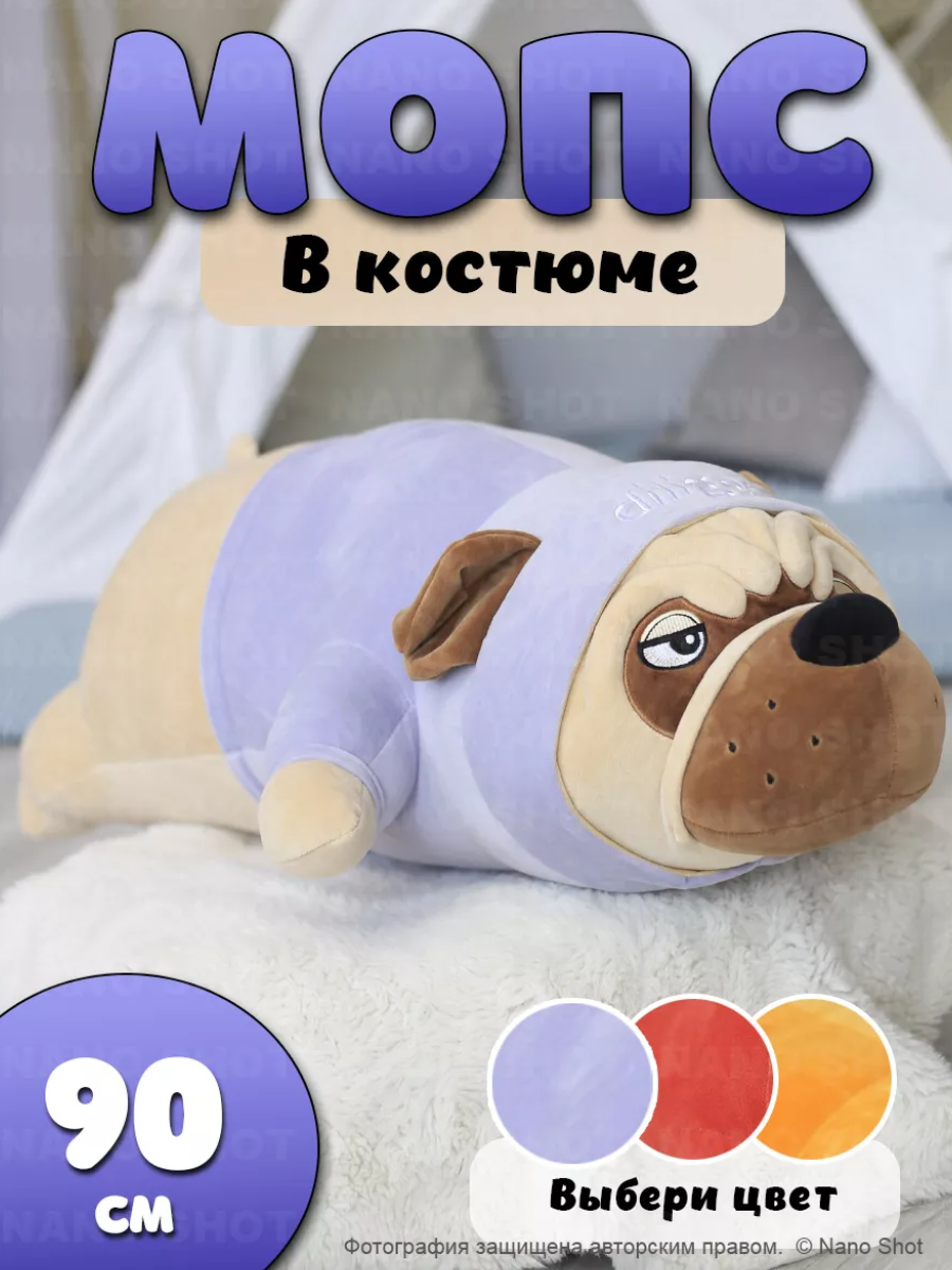 Мягкая игрушка-подушка Собака Мопс в голубом костюме, 90 см: сравнение цен, характеристики, фото, актуальное наличие и цены.