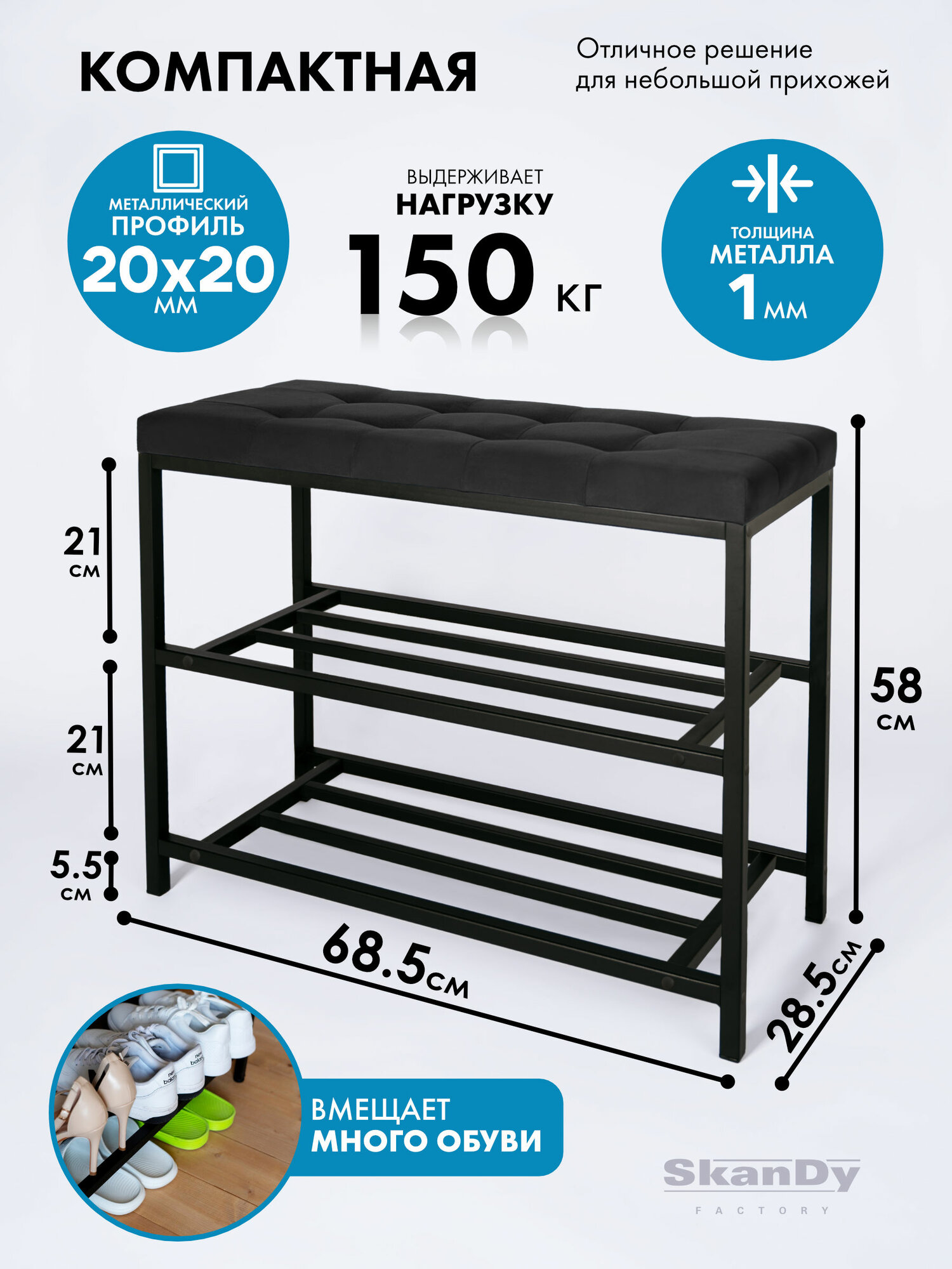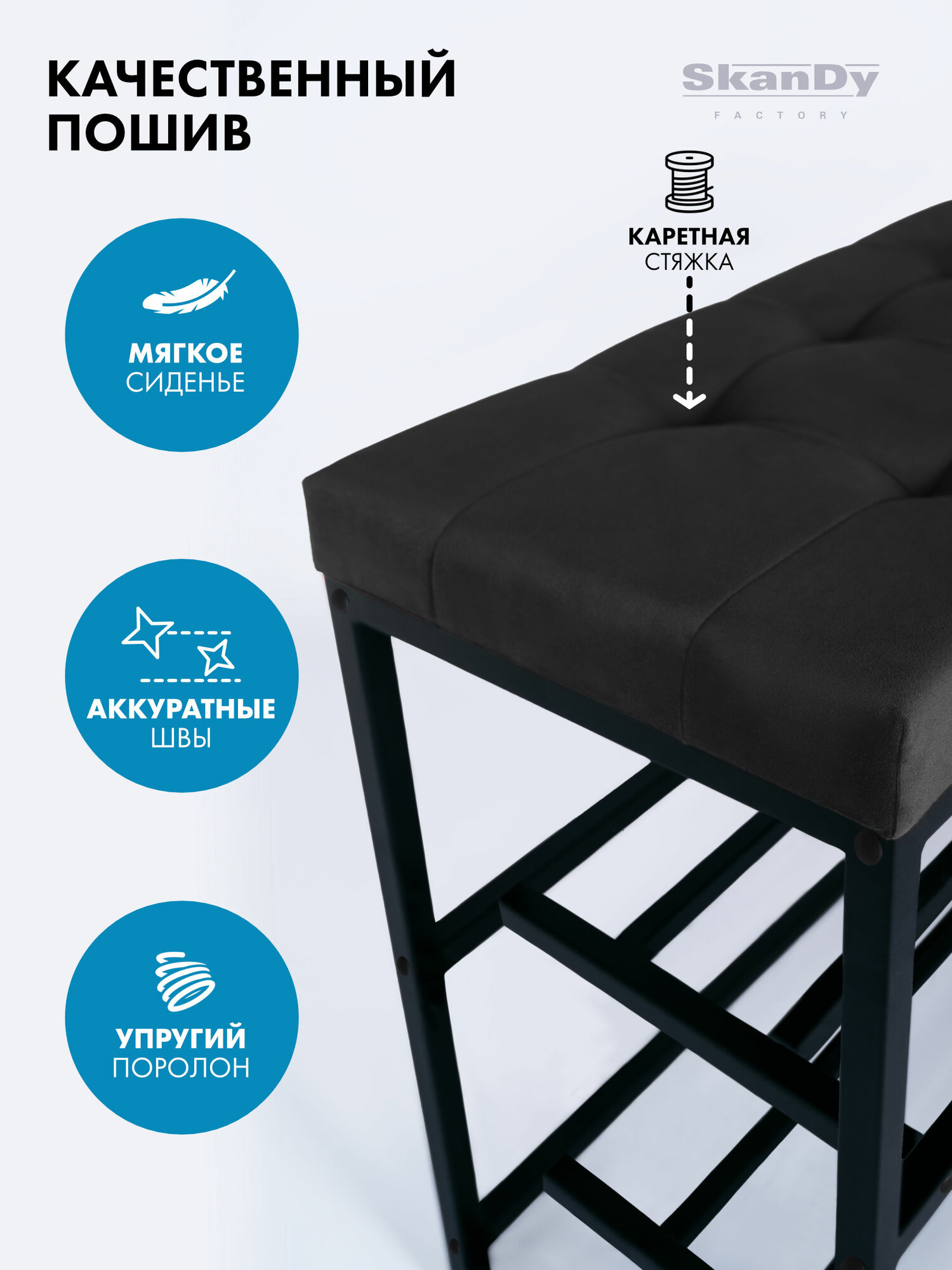 Идеальное решение для создания атмосферы в доме – обувница двухъярусная с мягким сидением в стиле loft. Этажерка подойдет для прихожей, гардеробной или балкона. Эргономичный пуф отлично впишется на лоджии или коридоре. Банкетка будет функциональной подставкой или комфортной мягкой скамейкой. Простая сборка (Фурнитура в комплекте). Полка для обуви создана для компактного хранения в квартире и на даче. Каркас выполнен из высококачественной стали с максимальной нагрузкой 150 кг, что делает металлическую обувницу безопасной и надежной. Окрашено матовой порошковой краской с текстурой муар. Мягкое сиденье выполнено из микровелюра Velutto и упругого ППУ наполнителя. Можно использовать как пуфик в прихожей. Тумба для обуви будет изящно смотреться в лофт, классическом или современном интерьере. Это идеальный подарок на новоселье для друга или родственника. В нашем каталоге вы можете найти настенные вешалки, панели и другую мебель в комплект.