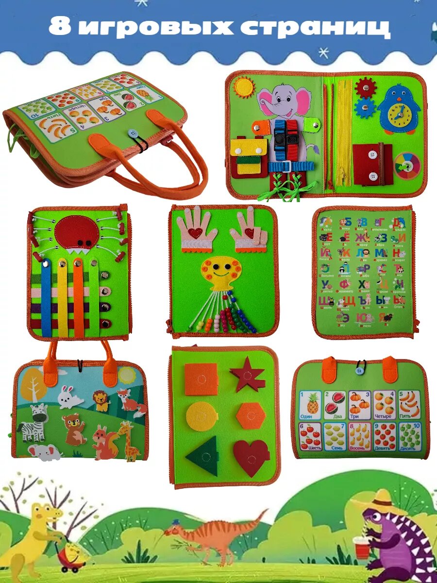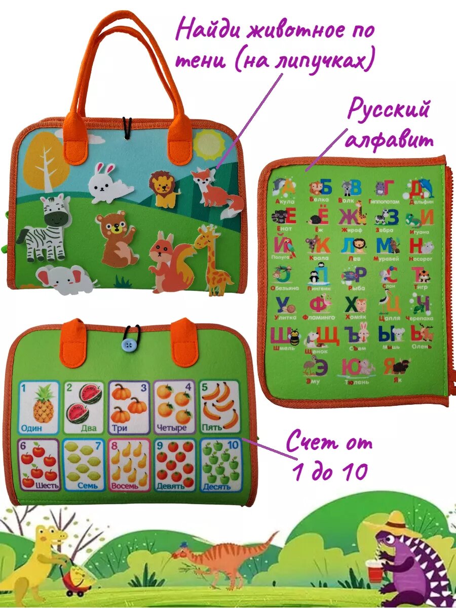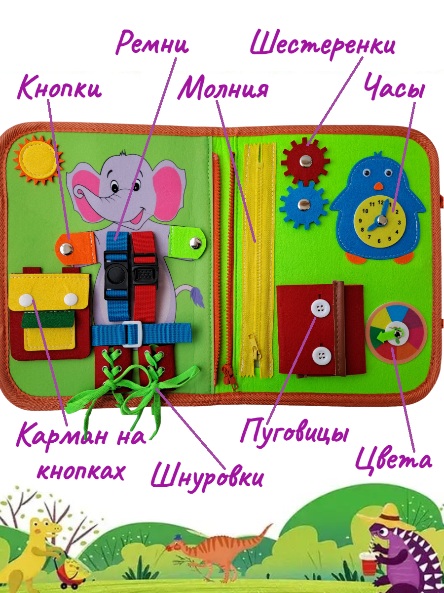 Мягкий бизиборд - развивающая игрушка для мальчиков и девочек, интересна как для малышей так и для деток постарше. Мини бизиборд - интересное занятие и обучающая игра. Книжка бизиборд для маленьких станет любимой игрушкой для вашего малыша. Мягкая дорожная игрушка заинтересует дошкольника познавательными и увлекательными элементами. Элементы держатся с помощью кнопок, застежек, липучек. Играя в бизиборд-чемоданчик малыш тренирует логику, внимание, усидчивость. Прокачивает с помощью развивашки мышление, воображение, логику. Легкий бизиборд развивашка тренирует координацию движений и мелкую моторику. Обучающий бизиборд улучшает память, расширяет кругозор. Ускоряется формирование речи. Изучайте алфавит. Развивайте мелкую моторику рук. Узнавайте цифры. Собирайте пазл-головоломку. Запоминайте цвета. Знакомьтесь с формами и фигурами. Развивайка для детей выполнена из безопасных гипоаллергенных материалов - мягкой тактильно приятной ткани текстиля – фетра. Бизиборт поможет приобрести целый набор важных навыков: открывать и закрывать ремень на брюках, застегивать молнию на куртке и кофте, застегивать кнопки, прилеплять липучки и завязывать шнурки. Настольные игры для детей подойдут как для индивидуальной игры, так и для совместного досуга с друзьями в садике или с родителями дома, на отдыхе, даче, в гостях. Дорожный бизиборд удобно взять с собой в путешествие на машине, самолете или поезде. Можно играть в коляске. Универсальные и безопасные детские развивалки используют для семейных игр, игр в дорогу, на море. Набор станет долгожданным подарком для ребенка до года и от 1 года, 2+, 3+, 4+ и 5 лет на день рождения. Логические игры с разнообразными замочками станут интересным подарком в садик для внучки и внука. Мягкий бизиборд подойдет в качестве креативного подарка мальчику и подарка девочке. Умные игры развивашки для малышей — интересный подарочный набор для племянницы, племянника. Прикольный подарок крестнику, крестнице на Новый год, Рождество или любой другой праздник.
