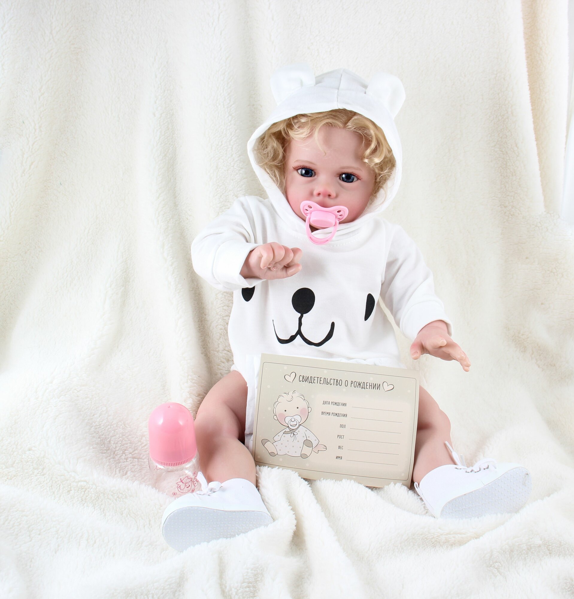 - В комплекте: кукла в одежде как на фотографиях, сертификат, бутылочка, соска, подгузник