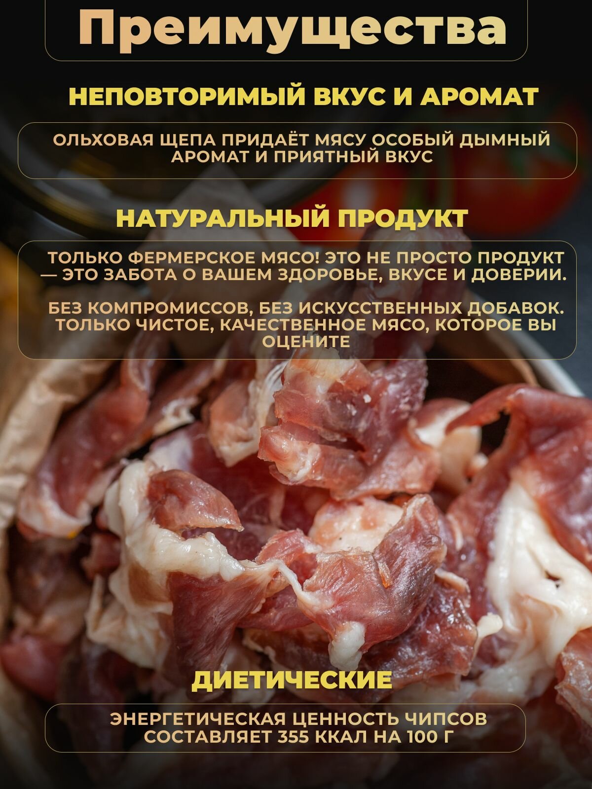Особая технология вяления на ольхе придаёт им характерный дымный оттенок и хрустящую текстуру. Это тонкие мясные слайсы — отличная альтернатива обычным снекам: без консервантов, из 100% свежего мяса, с высоким содержанием белка и железа. Энергетическая ценность — 355 ккал на 100 г.