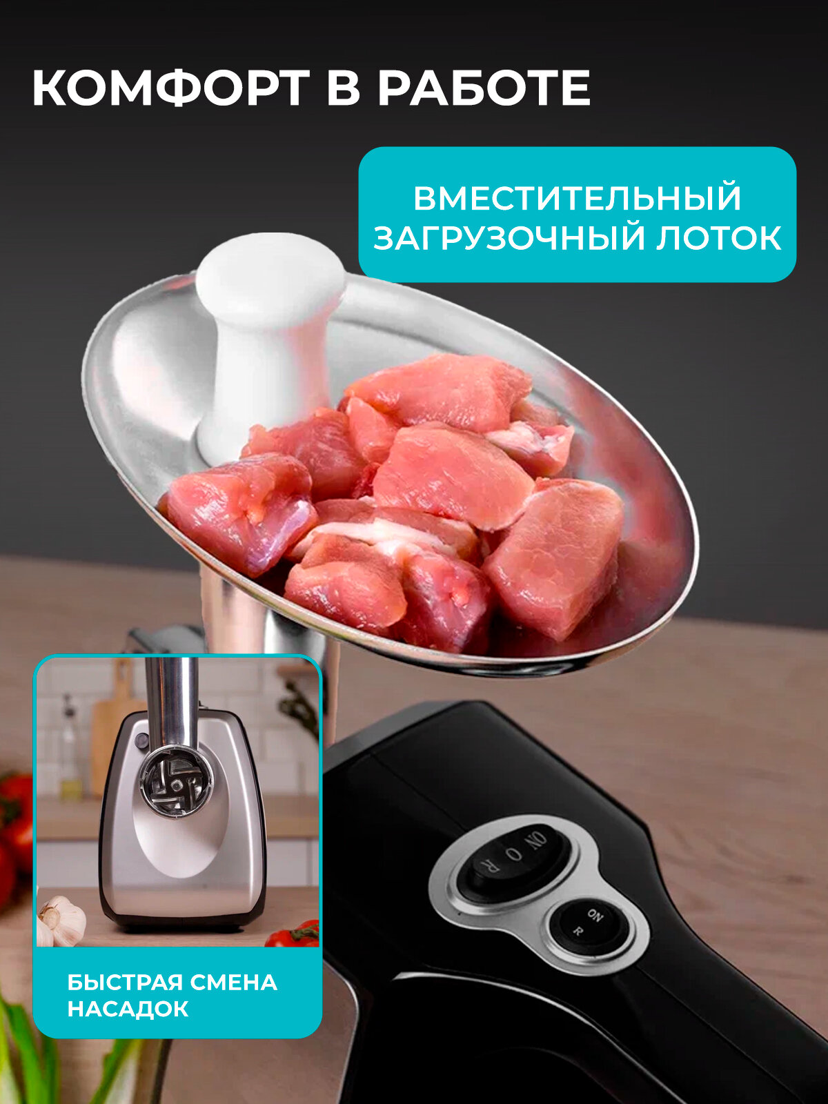 | Насадки | диск для фарша, насадка для кеббе, насадка для приготовления колбас, насадка для шинковки, соковыжималка |