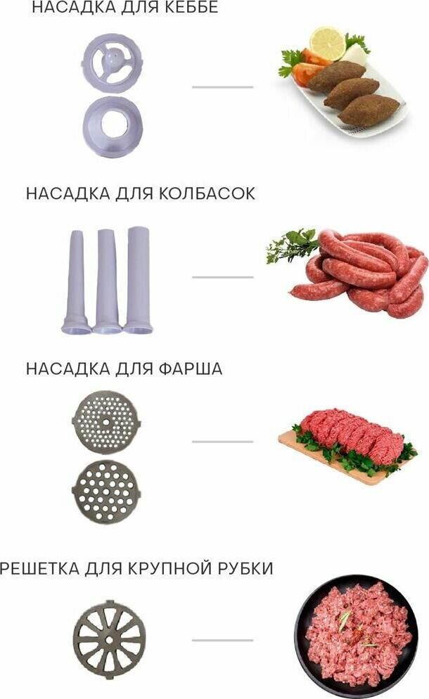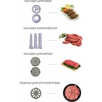 | Насадки | диск для фарша, насадка для кеббе, насадка для приготовления колбас |