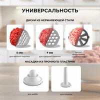 Мясорубка оснащена тремя перфорированными дисками для мелкой, средней и крупной нарезки. Также в комплекте идут дополнительные насадки для приготовления сосисок и "кеббе". Это позволяет выбрать необходимую степень измельчения продуктов в соответствии с рецептом.