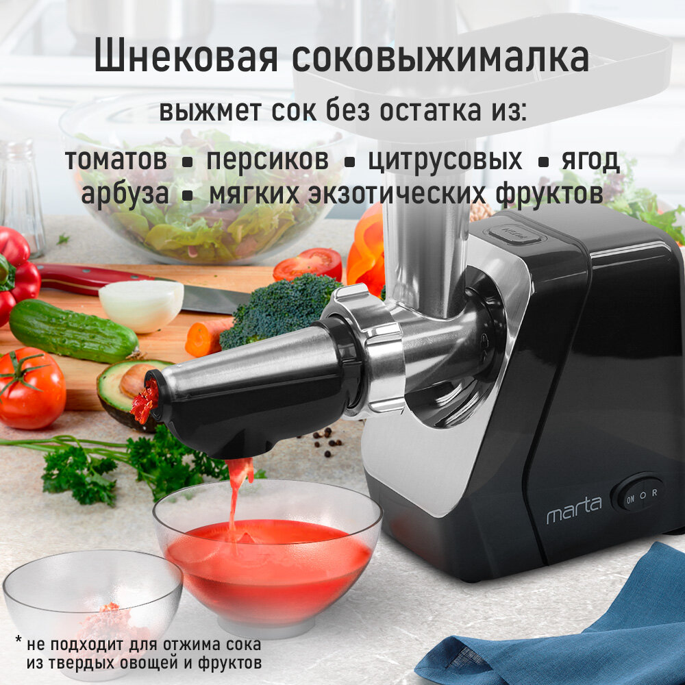 | Дополнительная информация | Мясорубка MARTA MG2029C, шнековая, пластик/металл, защита от перегрузки, черный жемчуг |