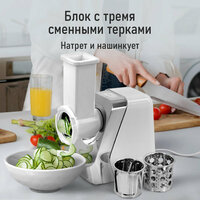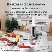 В комплекте с мясорубкой идут решетки для приготовления фарша с перфорацией 3.0/5.0/7.0, блок-терка (мелкая, крупная, шинковка), насадка-соковыжималка, насадки для колбас и кеббе, насадка для печенья и толкатель.