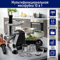 Мощность и производительность: мясорубка оснащена мощным двигателем на 2800 Вт, что обеспечивает быстрое и качественное измельчение мяса.