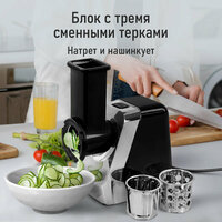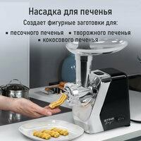 В комплекте с мясорубкой идут решетки для приготовления фарша с перфорацией 3.0/5.0/7.0, блок-терка (мелкая, крупная, шинковка), насадка-соковыжималка, насадки для колбас и кеббе, насадка для печенья и толкатель. Это позволяет вам приготовить разнообразные мясные и овощные блюда, а также сделать домашние колбасы и печенье.