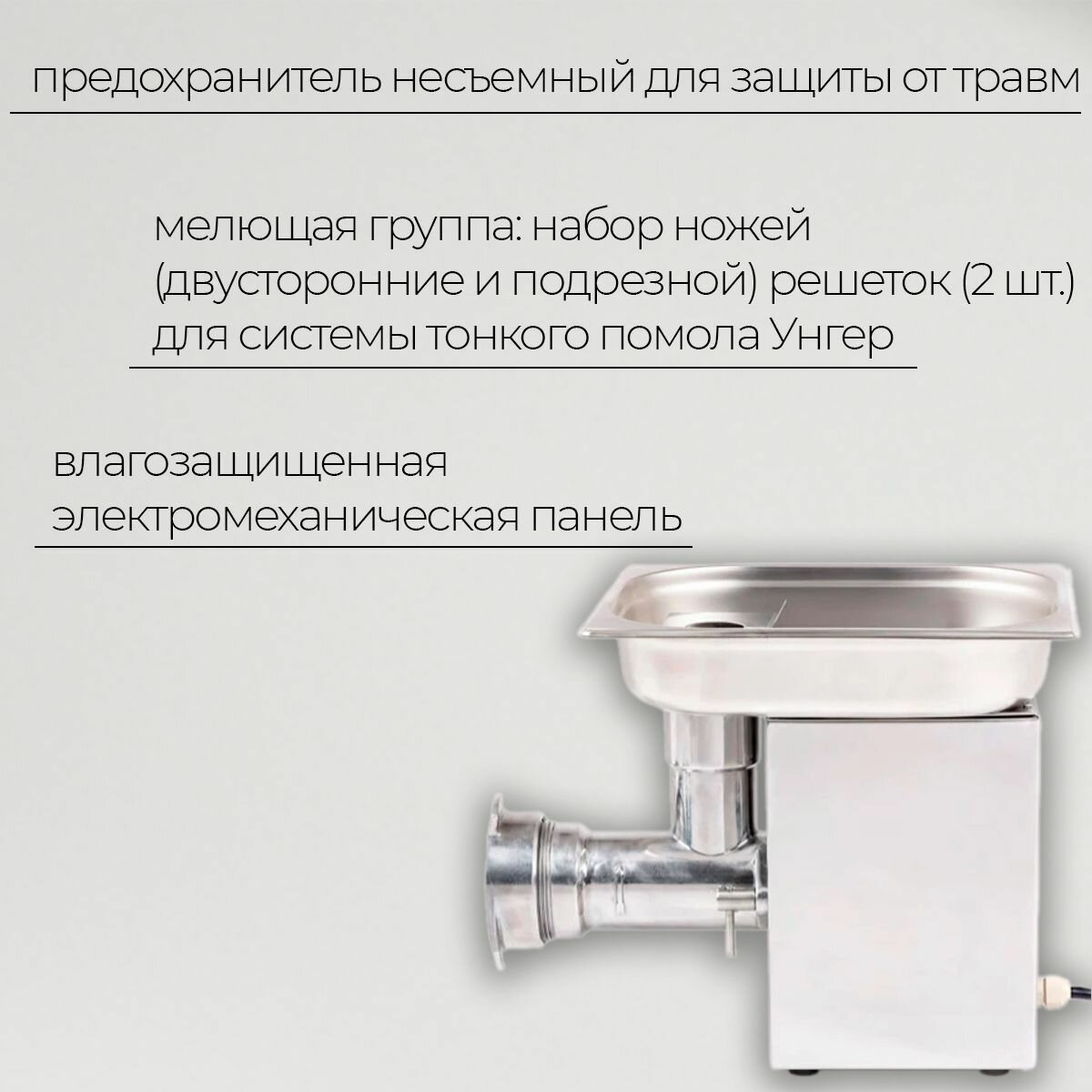 - Система ножей Unger: Мясорубка оснащена уникальной системой ножей Unger, которая обеспечивает идеальное измельчение мяса и рыбы на фарш.