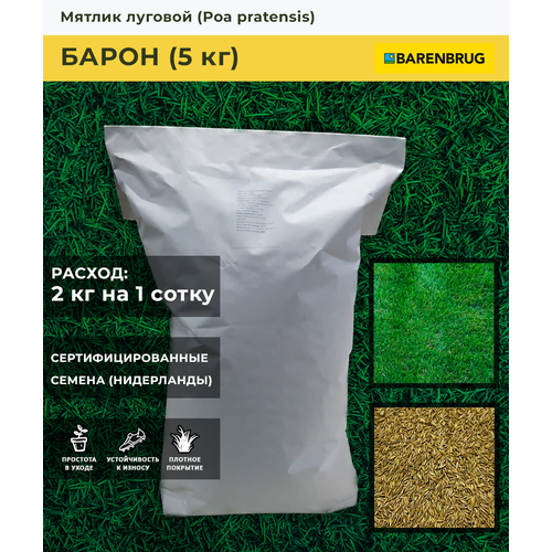 Мятлик луговой Барон - это высококачественный газонный материал, который обеспечивает превосходное качество и долговечность. Произведенный известным брендом BARENBRUG, этот продукт зарекомендовал себя как надежный и устойчивый к различным условиям.