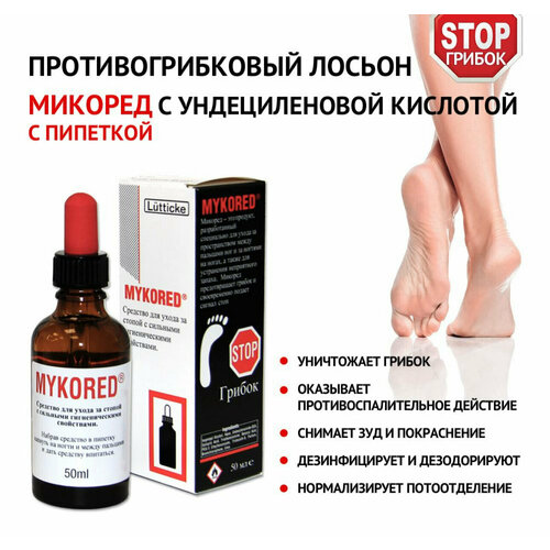 Средства серии Mykored были разработаны для эффективной защиты кожи. стоп и ногтей от грибковых инфекций. Эти средства борются с возникновением неприятного запаха. Грибковые инфекции быстро распространяются по всей стопе и в труднодоступных местах между пальцами ног. Чаще всего инфекция передается при посещении бассейна, сауны и других мест общественного пользования. Таким образом, хороший уход за ногами является лучшей защитой против этих инфекций. Применение средств Mykored во время процедуры педикюра исключает риск заражения триковыми заболеваниями. Перед поступлением в продажу каждая партия продукта проходит микробиологическое тестирование независимым институтом. Вся продукция сертифицирована как в Германии, так и в России и соответствует требованиям международного стандарта. Средство по уходу за кожей стоп с дезинфицирующим, дезодорирующим и противогрибковым эффектом. При регулярном использовании защищает кожу и ногти от появления грибковых инфекций, прекрасно увлажняет и предотвращает появление неприятного запаха. Лосьон с пипеткой очень экономичен, его удобно использовать как для ногтей, так и для ухода за труднодоступными межпальцевыми промежутками ног. Лосьон-спрей идеально подходит для профилактики грибковой инфекции после посещения бассейнов, саун, спортивных залов и других мест общественного пользования.