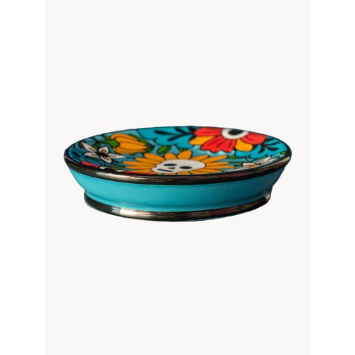 Мыльница керамическая для ванной на столешницу или раковину с объемным рисунком черепа с цветами, является частью коллекции Los Muertos, в которой есть все необходимое, чтобы наполнить интерьер ванной комнаты яркими красками мексиканского праздника. Коллекция Los Muertos представлена в Likemyhome в полном составе. Протирать с помощью мыльного раствора мягкой тряпкой. Не рекомендуется использовать абразивные и химически активные вещества для ухода за изделием. Не класть в морозильник, посудомоечную машину, микроволновую печь. Выпуклые части не дадут мылу прилипнуть Объемный рисунок Покрытие: глянцевая глазурь Печатный деколь